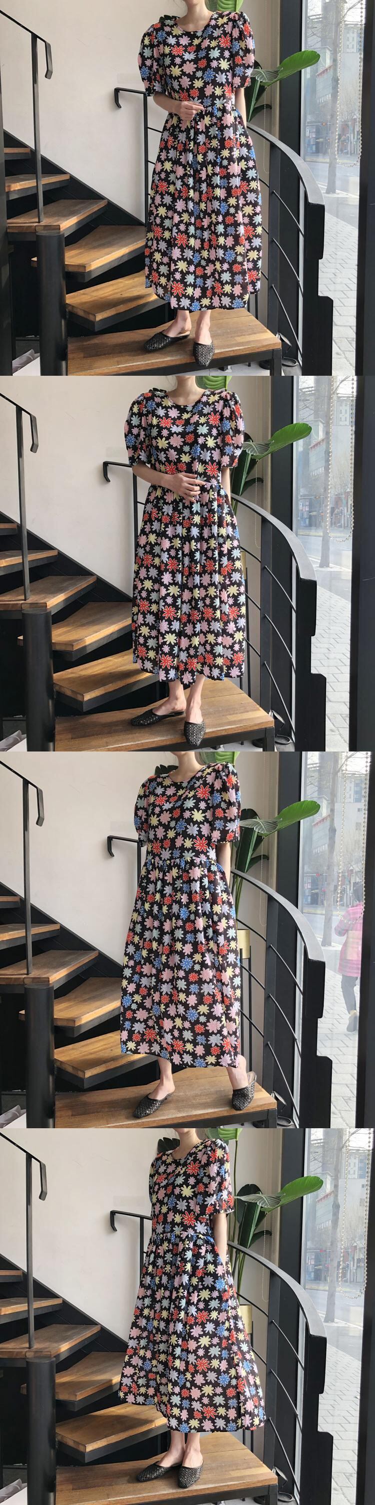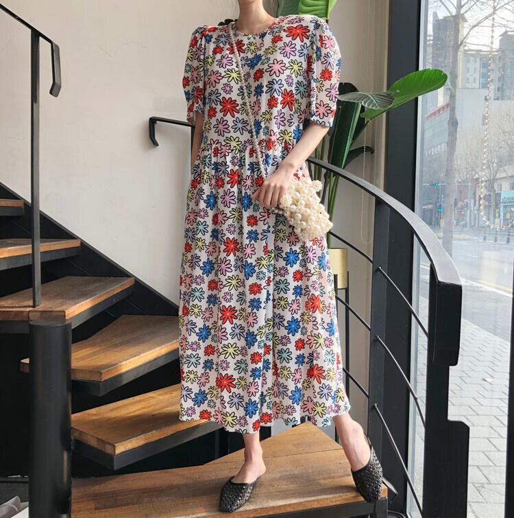Flowerデザイン ハイウェストウェストルーズスタンダードフローラルドレス サマースリーブシフォンロングスカート レトロ 大人ガーリー スウィート キュート カジュアル 夏物 花柄 フラワーデザイン 韓国婦人1237135778
