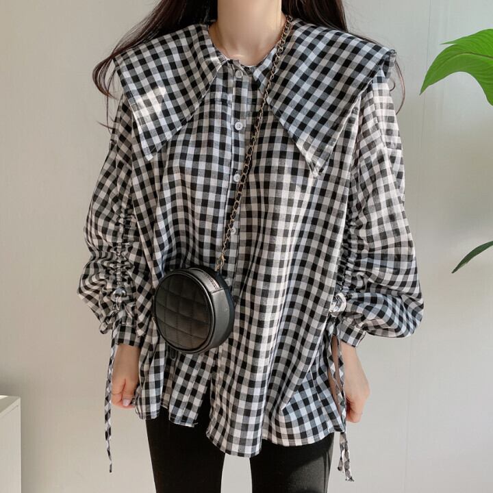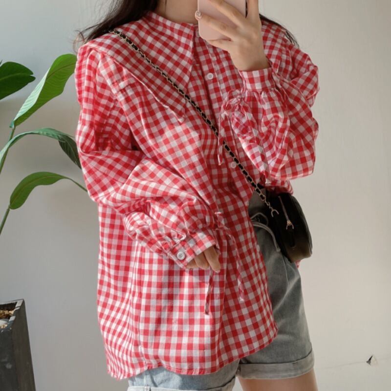 スプリングサマースタンダードギャザースタイルルーズ格子柄シャツ レッド レトロ 春物 夏物 韓国婦人74209996296