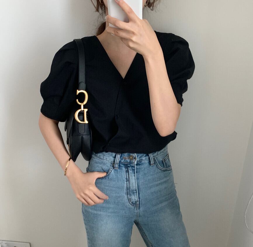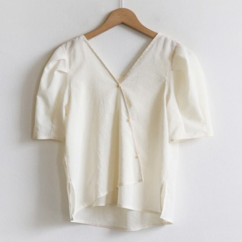 サマーVネックシャツ スタイル薄手スタンダードブラウス ロング コットン レトロ 夏物 韓国婦人33937363727