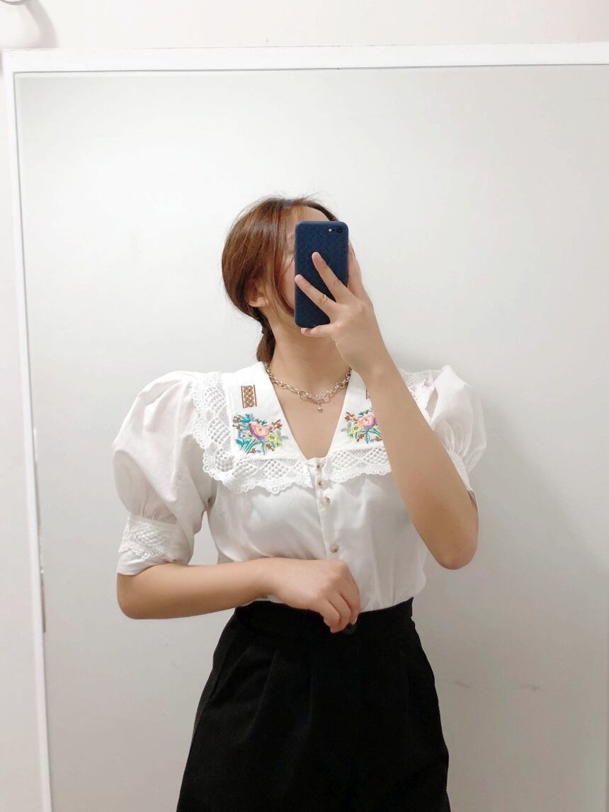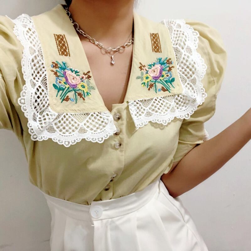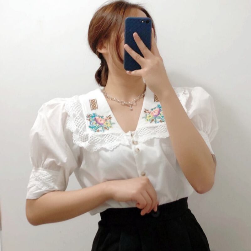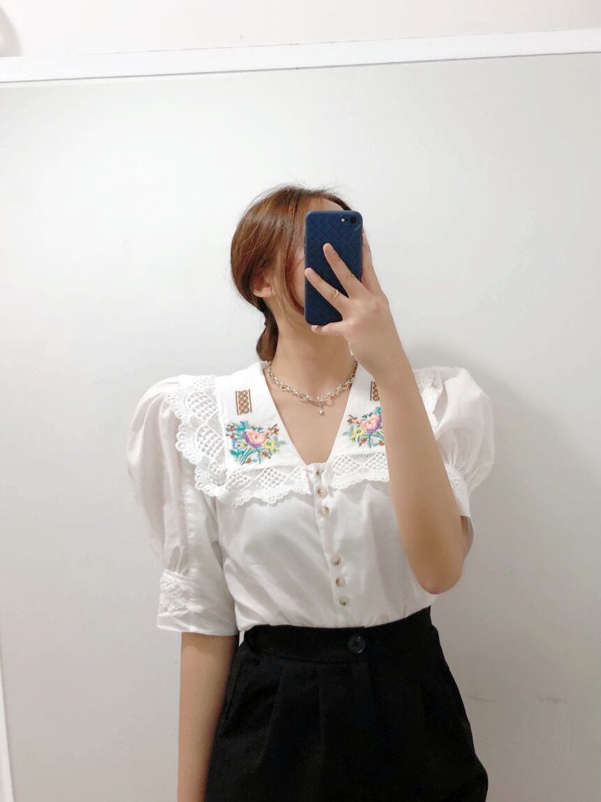 シャツ サマースタイルスタンダード刺繍カラーレーススリーブトップス レトロ 夏物 韓国婦人78300380212