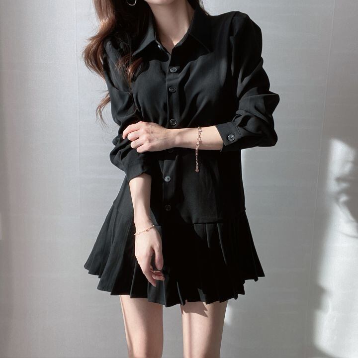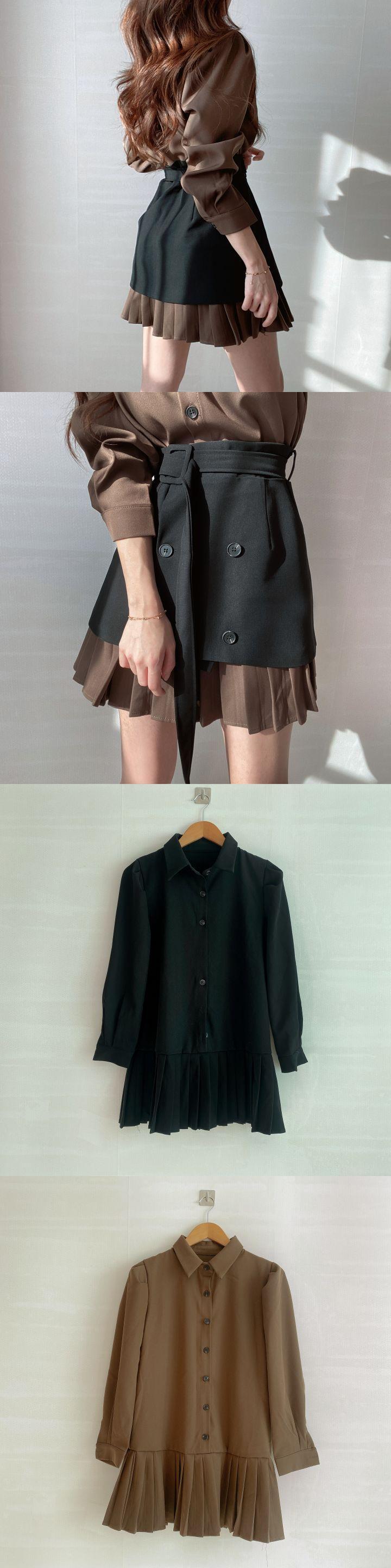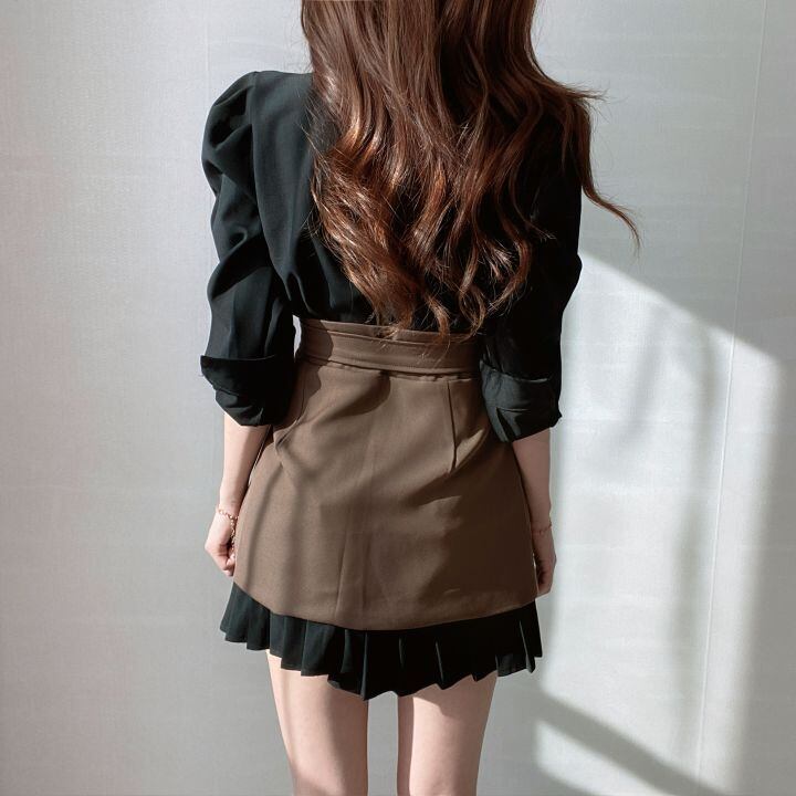プリーツスリーブシャツ ドレス ハイウェストウェストレーススリムスカート ショート 韓国婦人71014251095