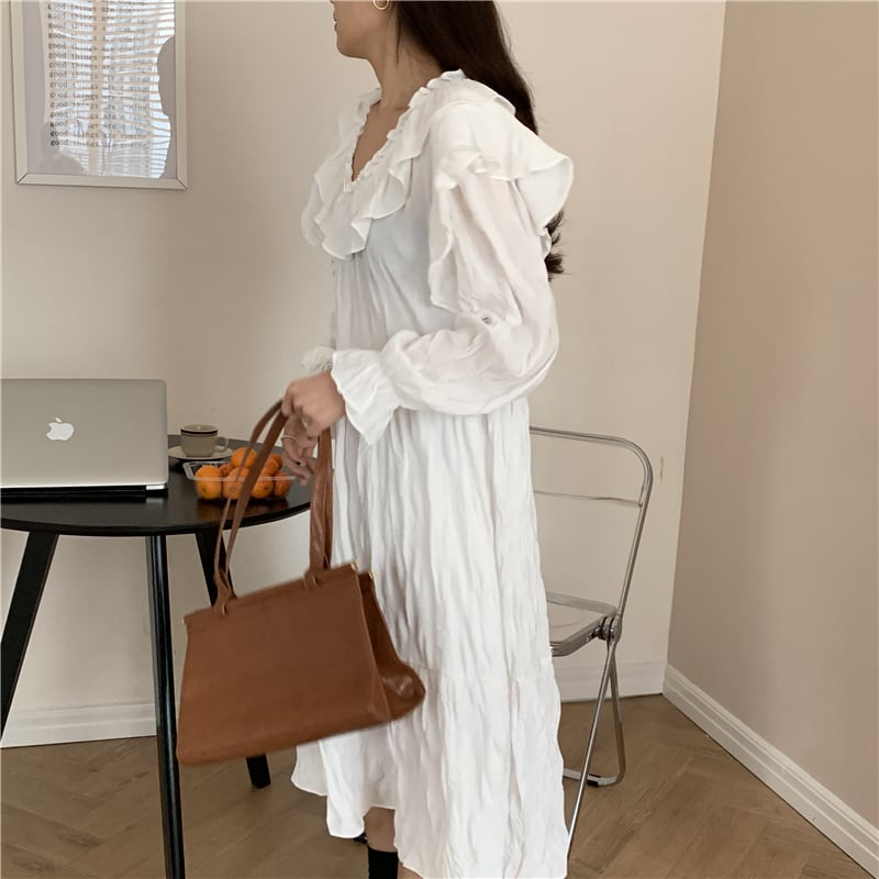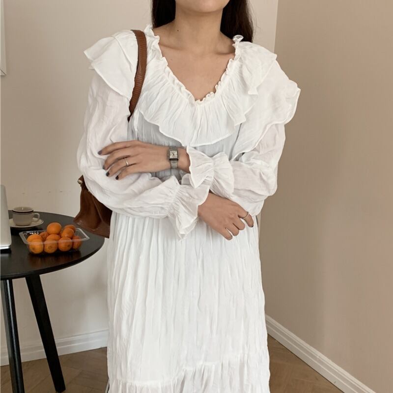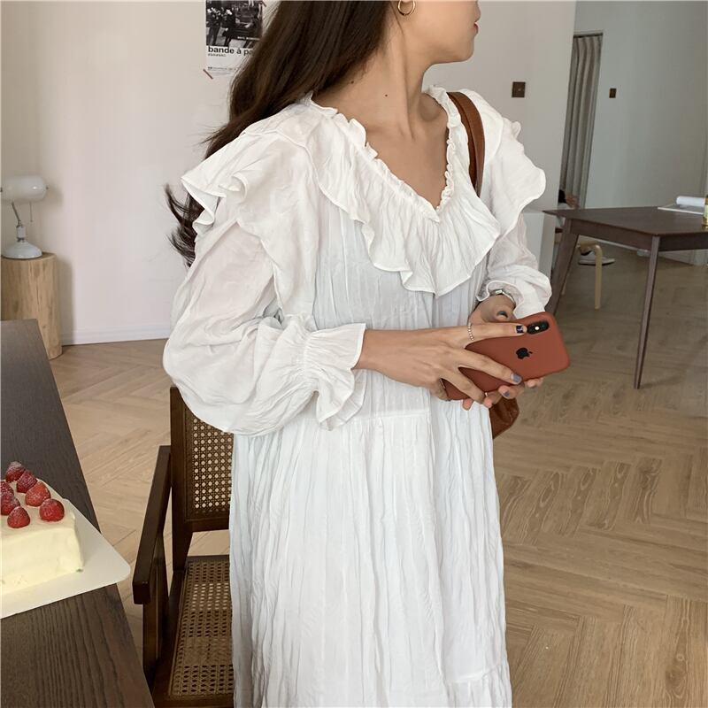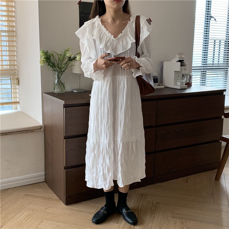 Vネックスリムホワイトドレス スプリングスカート ロング 春物 韓国婦人1959252681