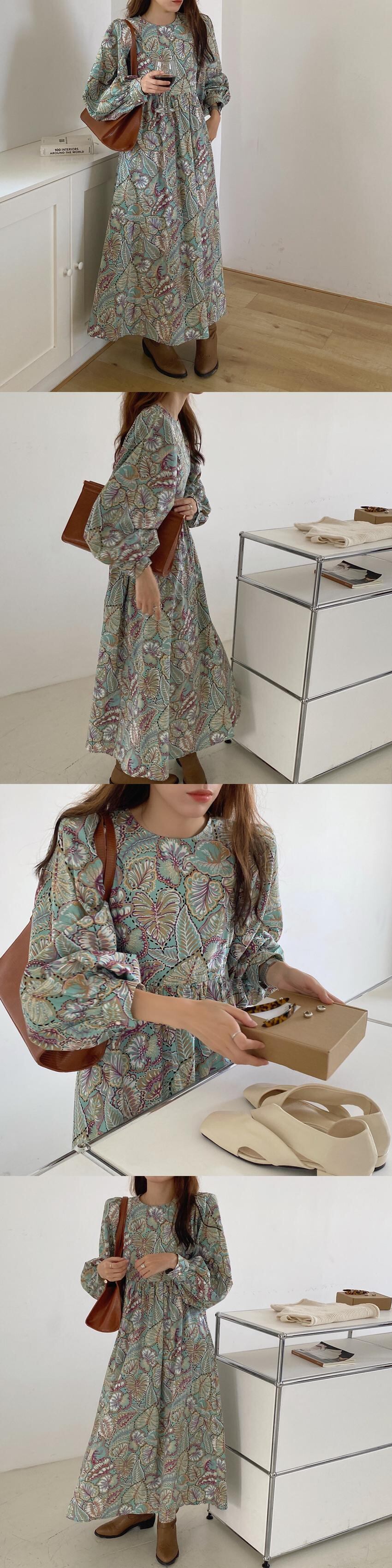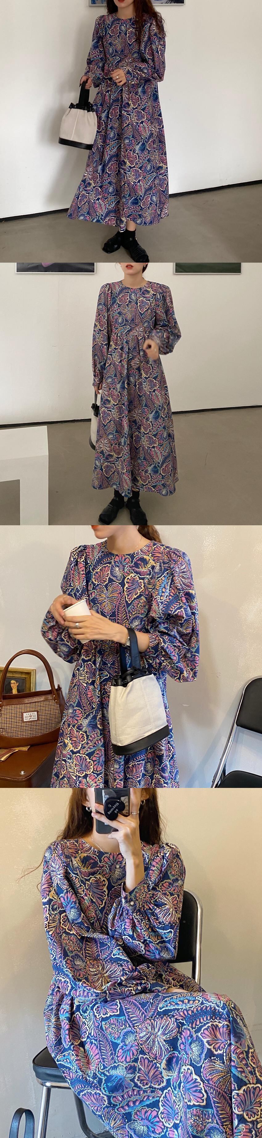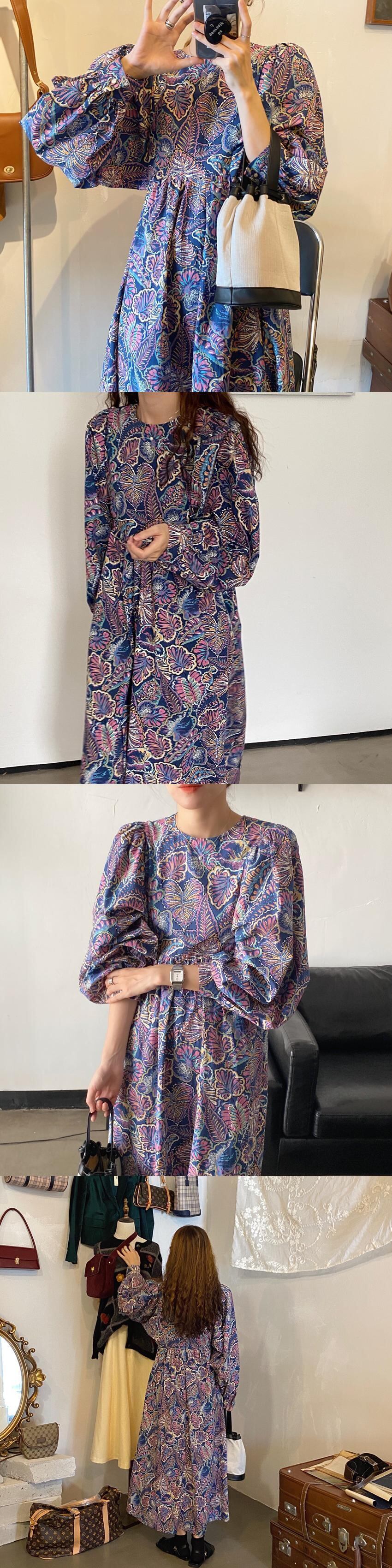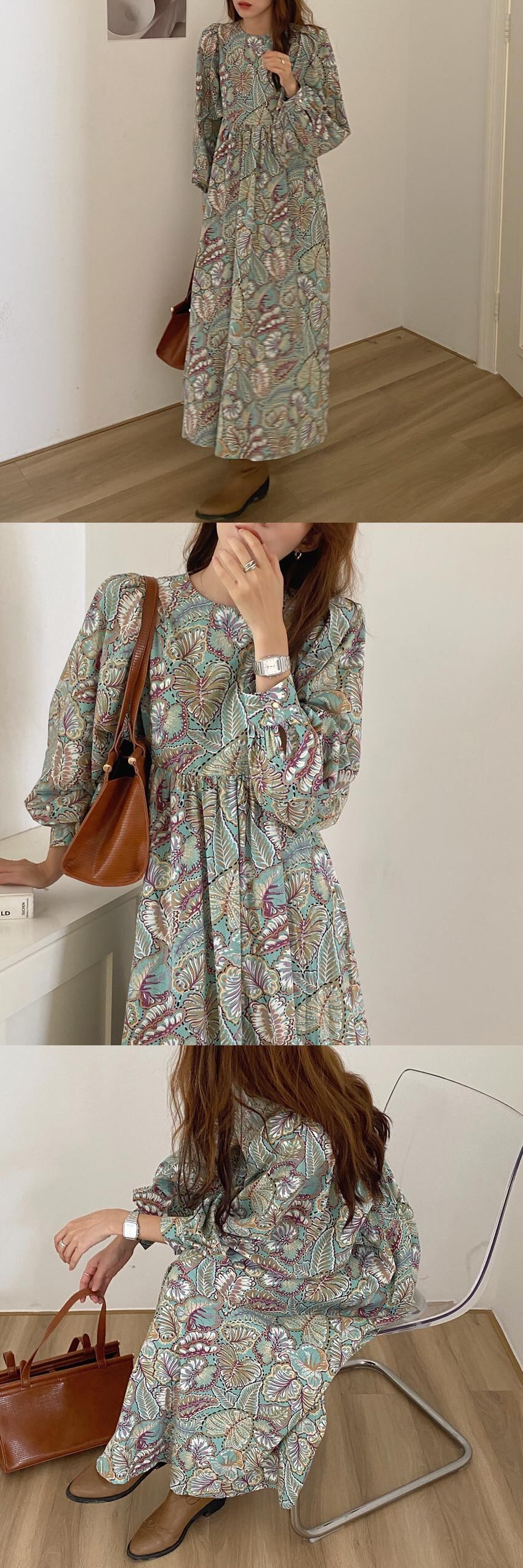 スプリングプリントスリーブハイウェストウェストルーズドレス ロングスカート 春物 韓国婦人21460784455
