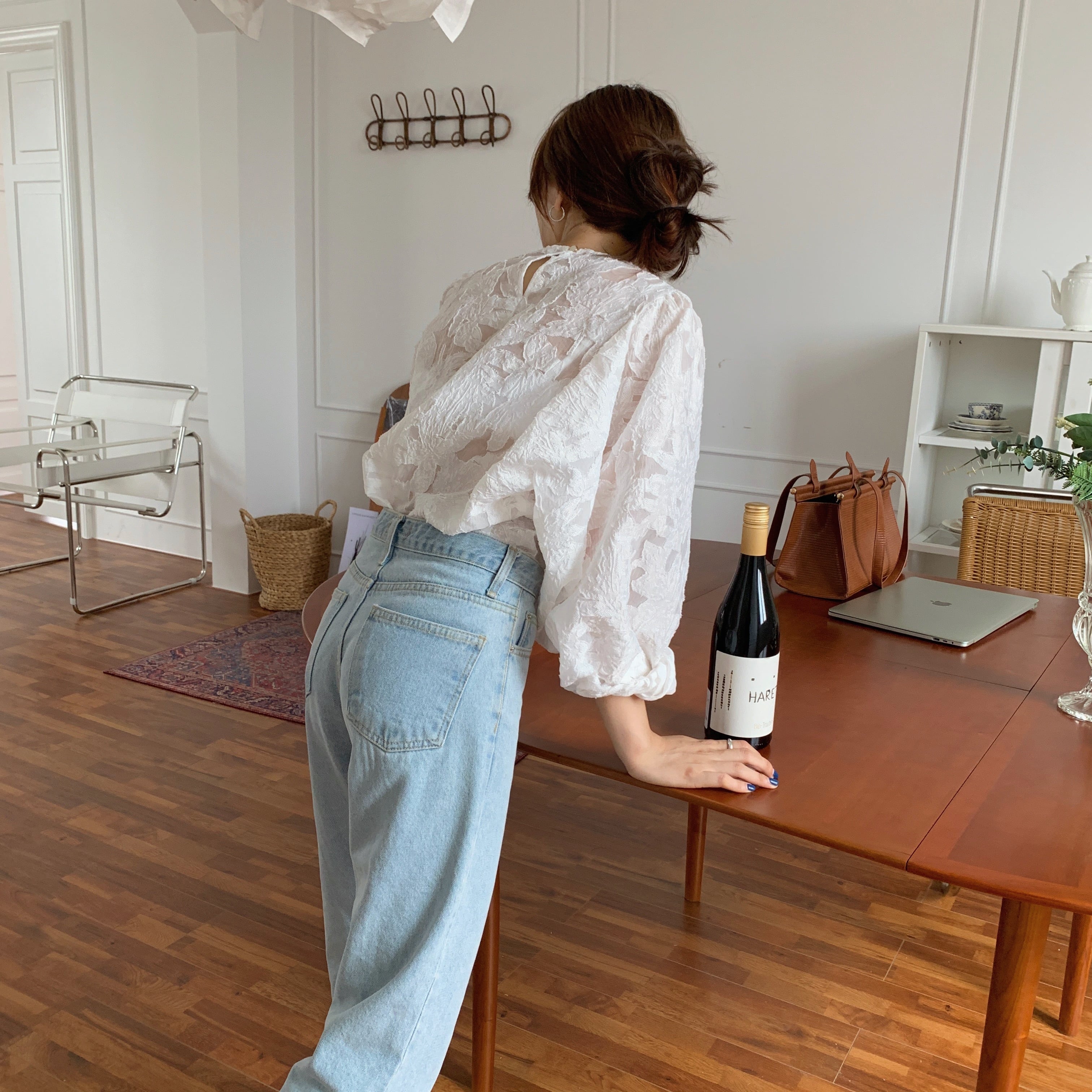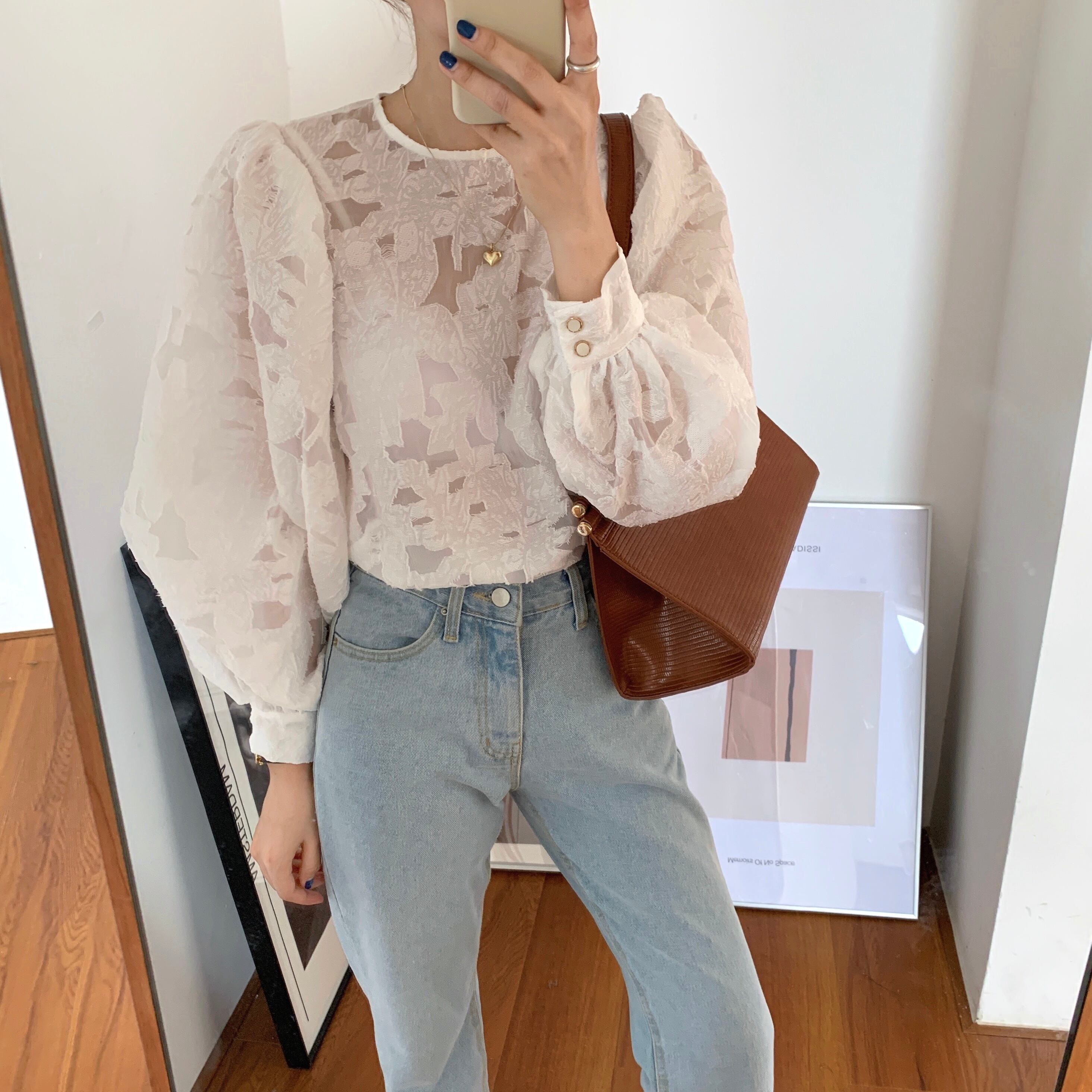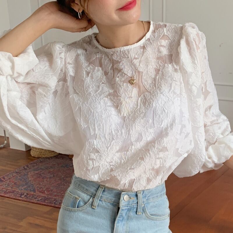 スプリングスタイルラウンドネックルーズスリーブホワイトシャツ ブラウス レディース 春物 Oネック 韓国婦人6659540988