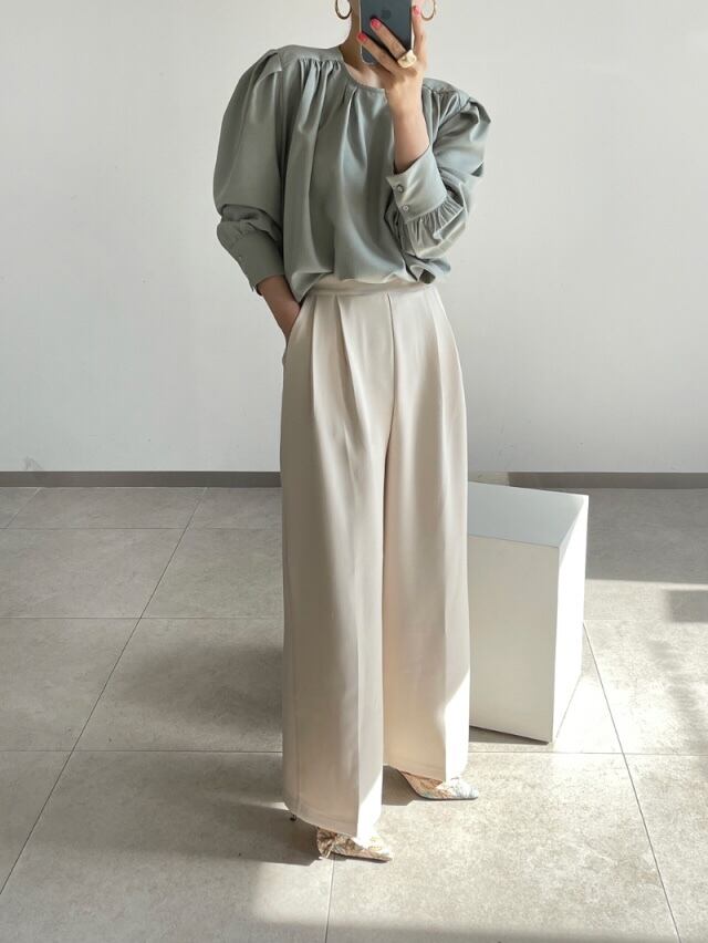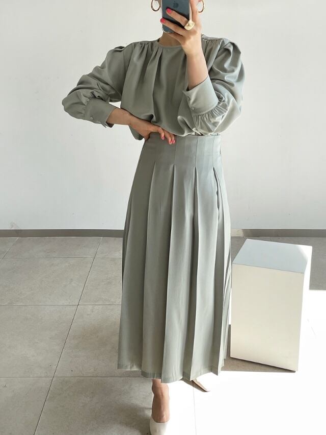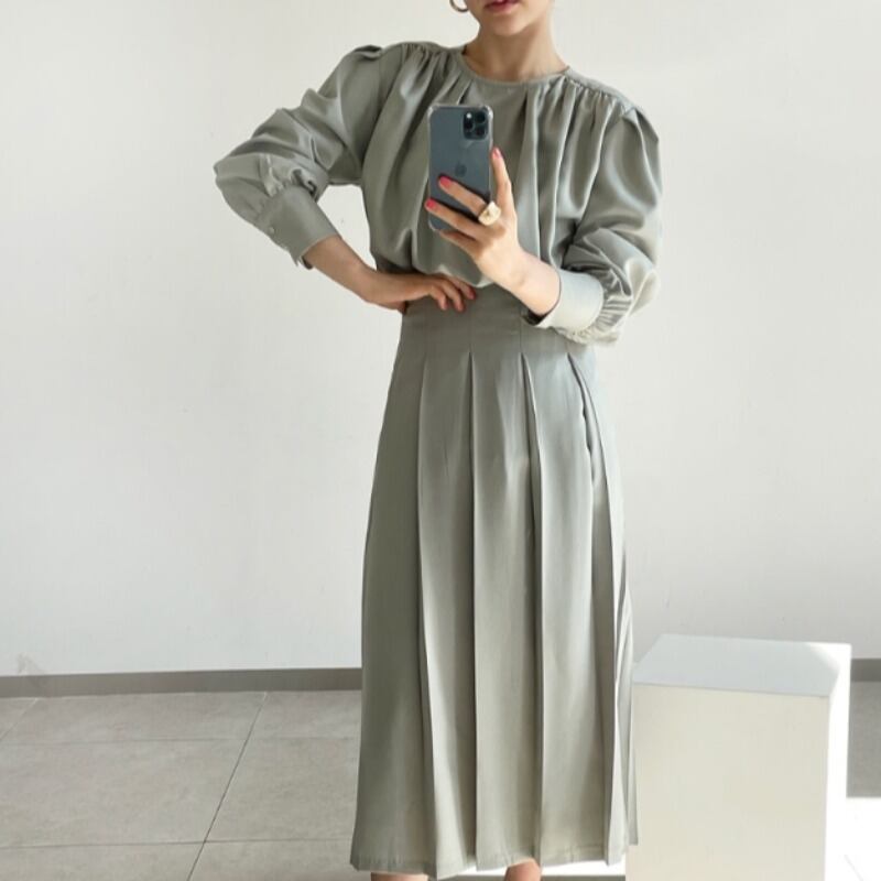 スプリングラウンドネックプリーツルーズシャツ ハイウェストウェスト薄手スカート レディース 春物 Oネック 韓国婦人81783642209
