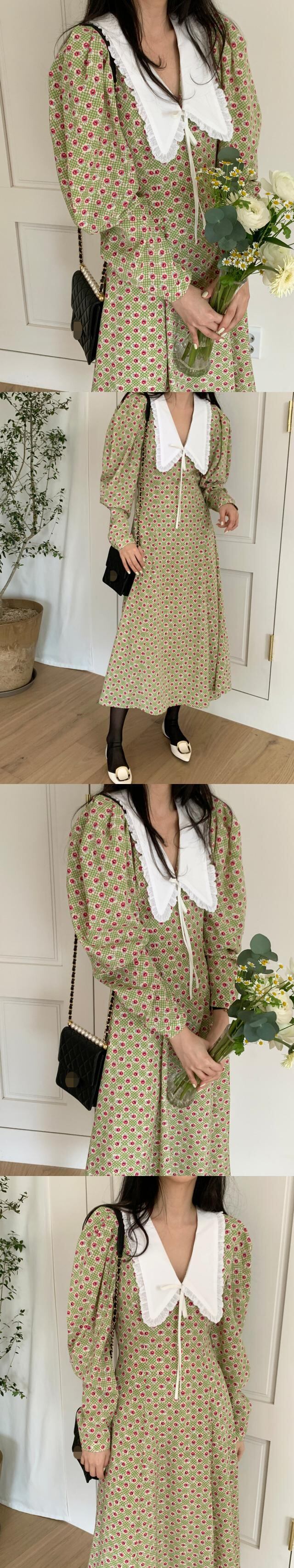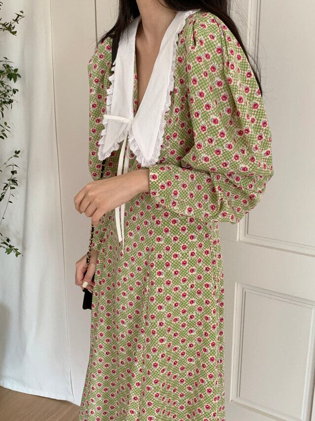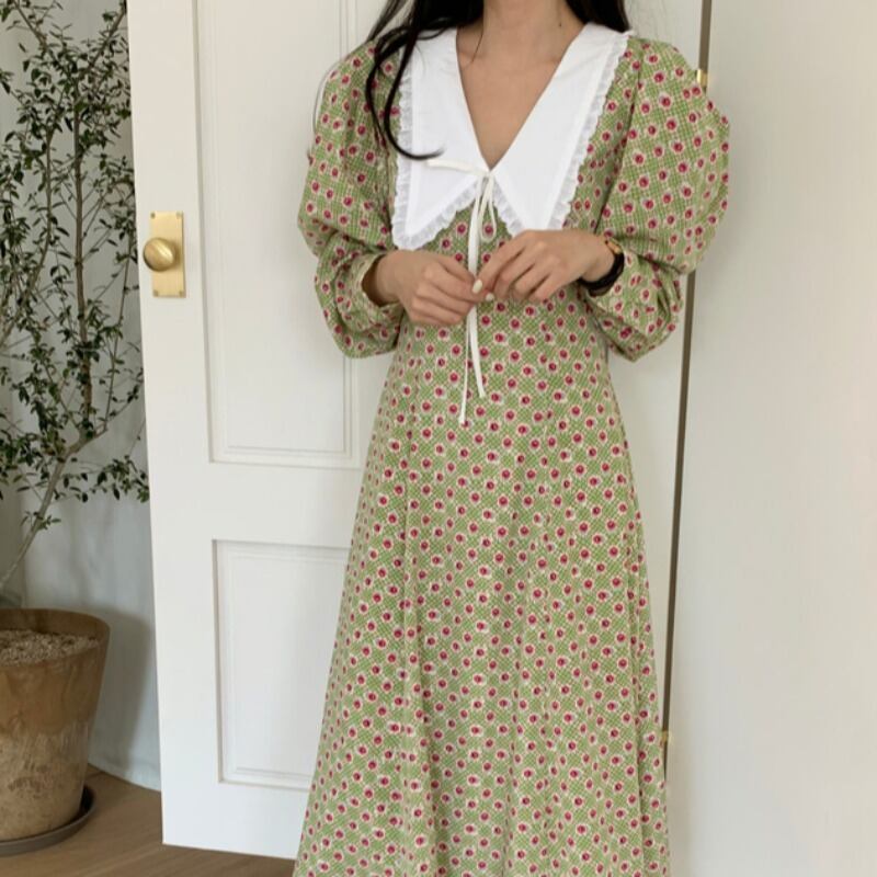 スタンダードフローラルカラールーズ薄手Vネックロングスカート スプリングドレス レトロ 春物 花柄 韓国婦人27566824589