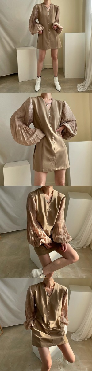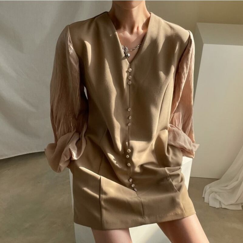 スリーブVネックドレス スプリングオータムスタンダードウェストスカート ショート レトロ 春物 秋物 韓国婦人16140328082