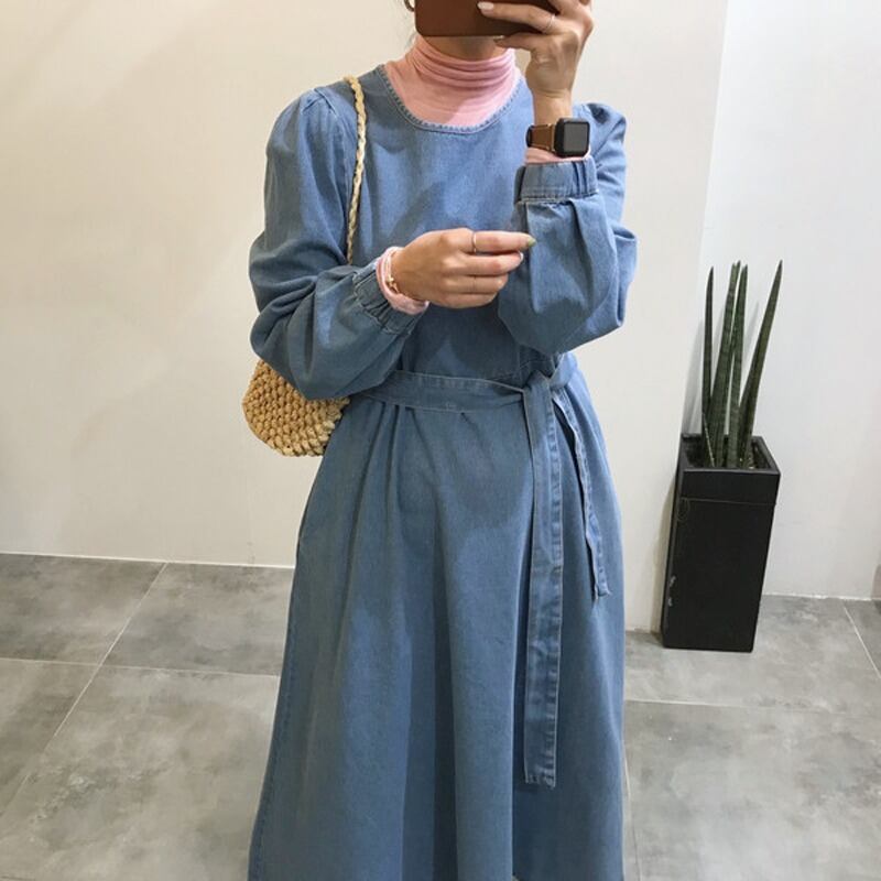 スプリングスタンダードラウンドネックルーズロングドレス レーススカート レトロ 春物 Oネック レースアップ 韓国婦人41238193662
