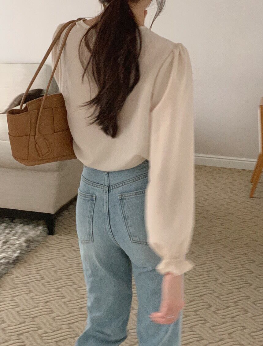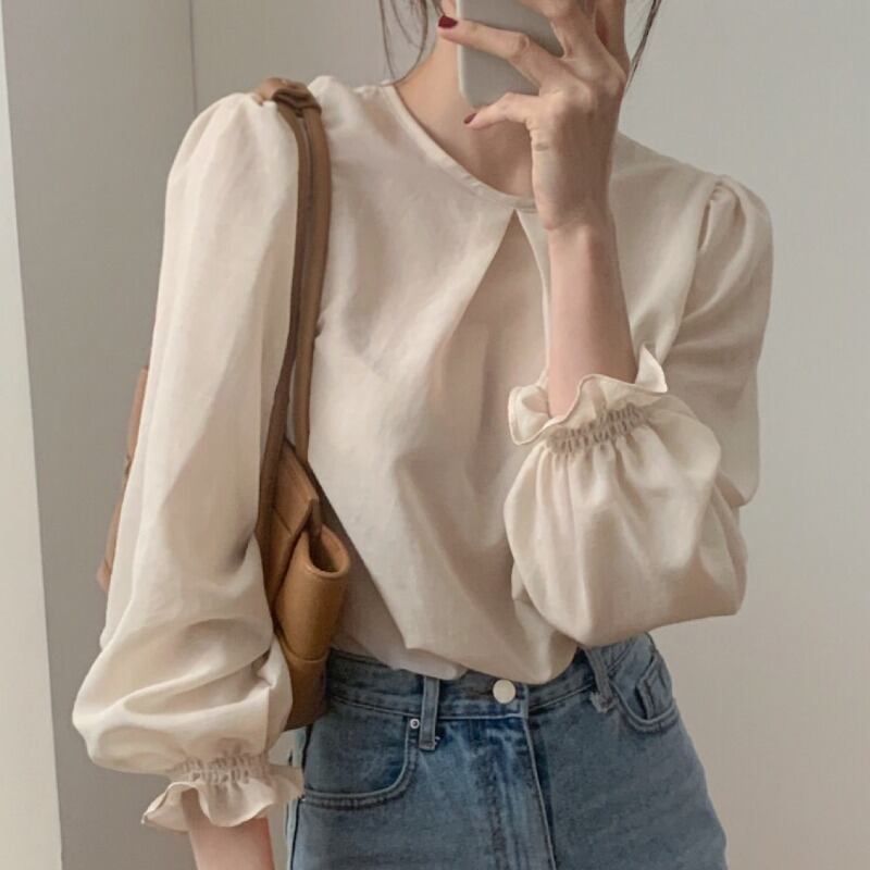 スタイルプリーツラウンドネックシャツ スプリングスリーブトップス 春物 Oネック 韓国婦人79641388820