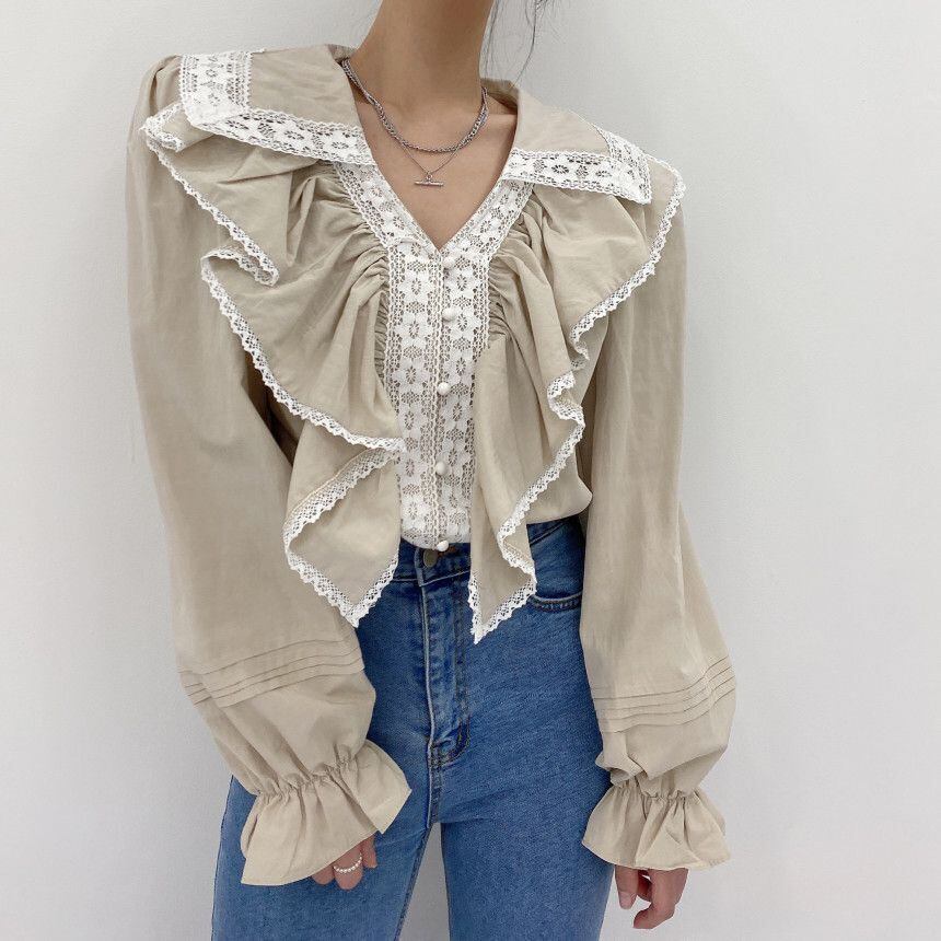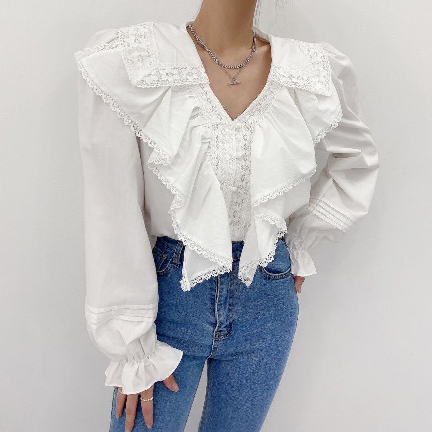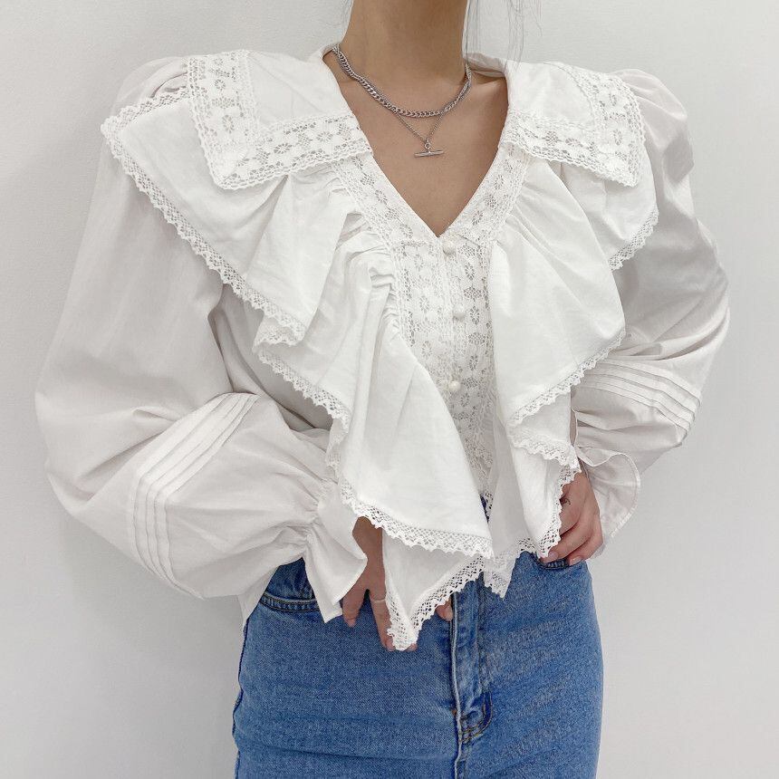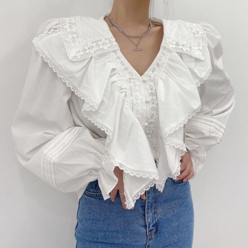 ホワイトシャツ Vネックラッフルレーススタイルスリーブトップス ステッチ 韓国婦人53266138121