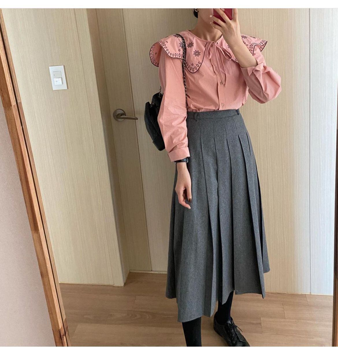 刺繍カラーシャツ ハイウェストウェストプリーツスカート ロング レース 大人ガーリー スウィート キュート カジュアル 韓国婦人25046163005