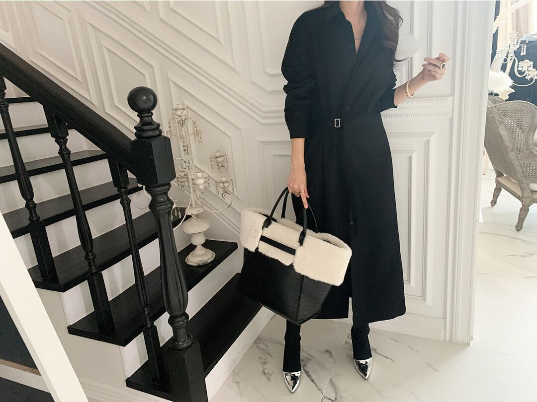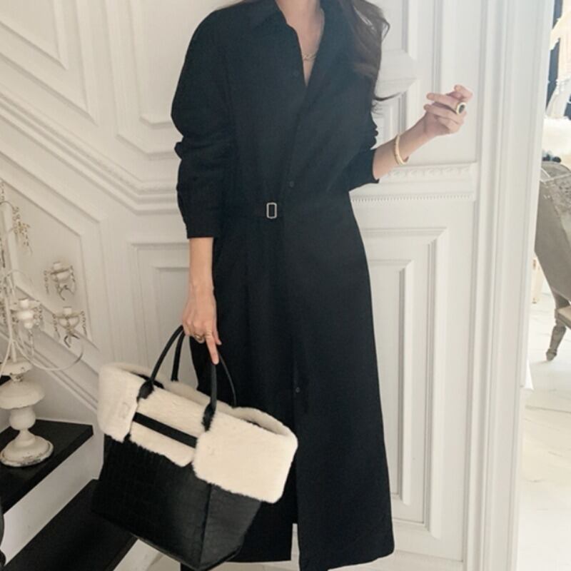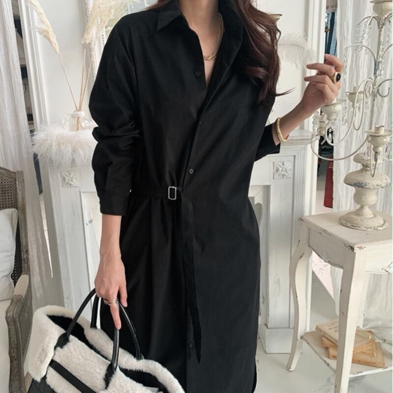 スプリングソリッド カラーサイドスリットウェストベルト シャツ スタイルドレス 春物 ハーネス ソリッドカラー 韓国婦人69325965084