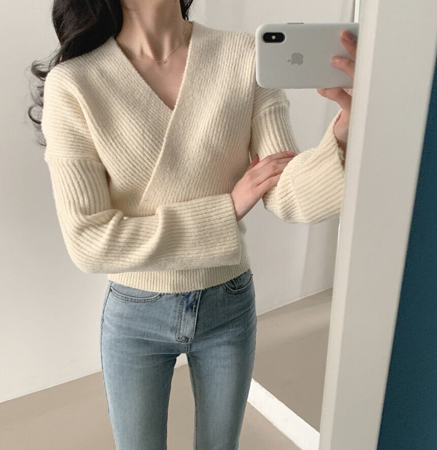 スプリング薄手クロスVネックハイウェストセーター トップス レディース ロング 春物 韓国婦人24411182038