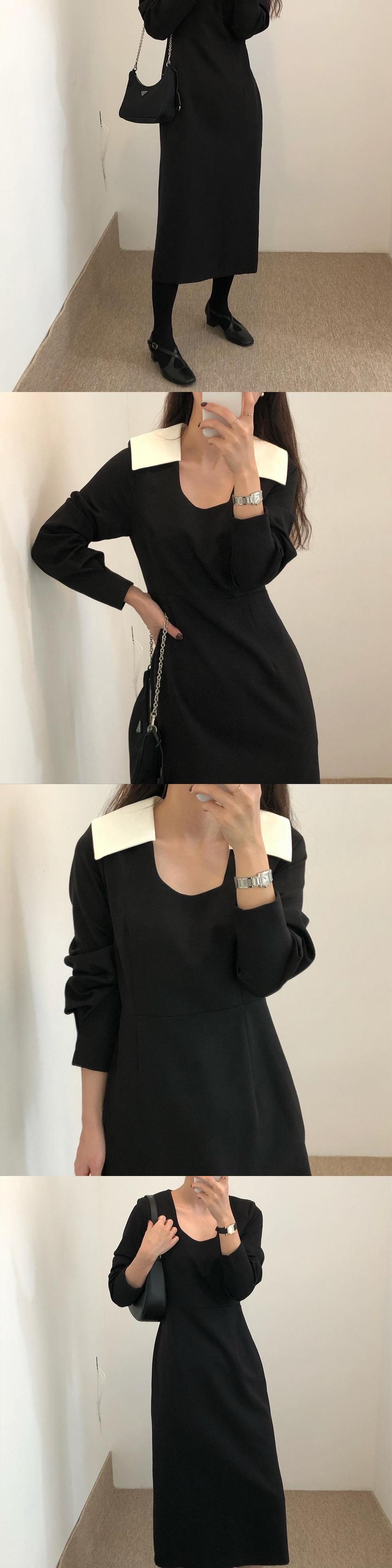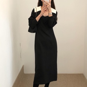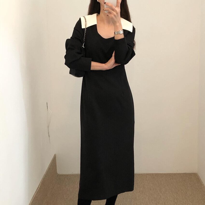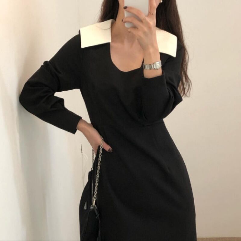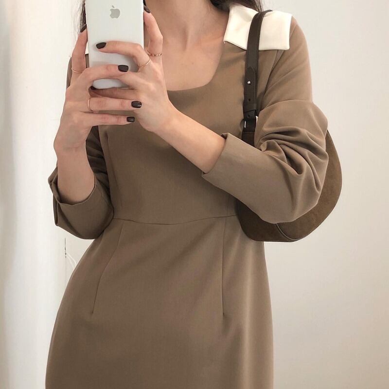 オータムスタンダードカラースリーブロングウェストドレス レトロ レース 秋物 レースアップ スクウェア 韓国婦人26229553081