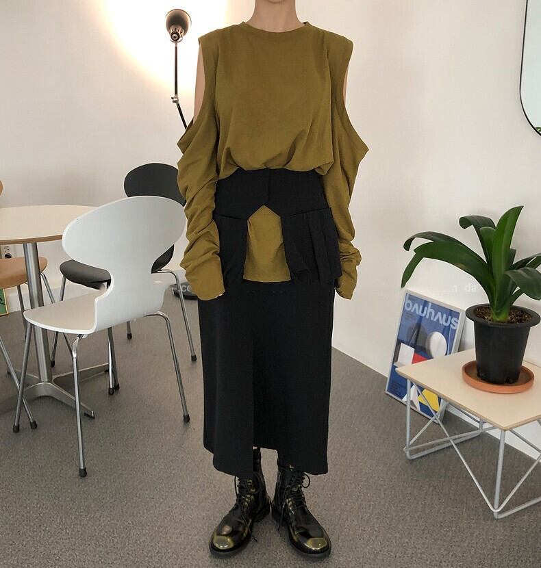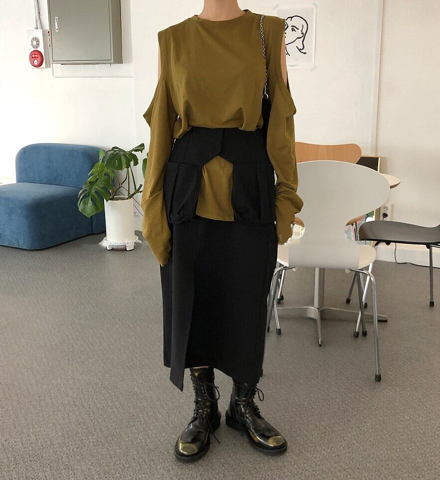 スプリングルーズストラップレスTシャツ ラウンドネックソリッド カラートップス ロング 春物 Oネック ソリッドカラー 韓国婦人12131154371