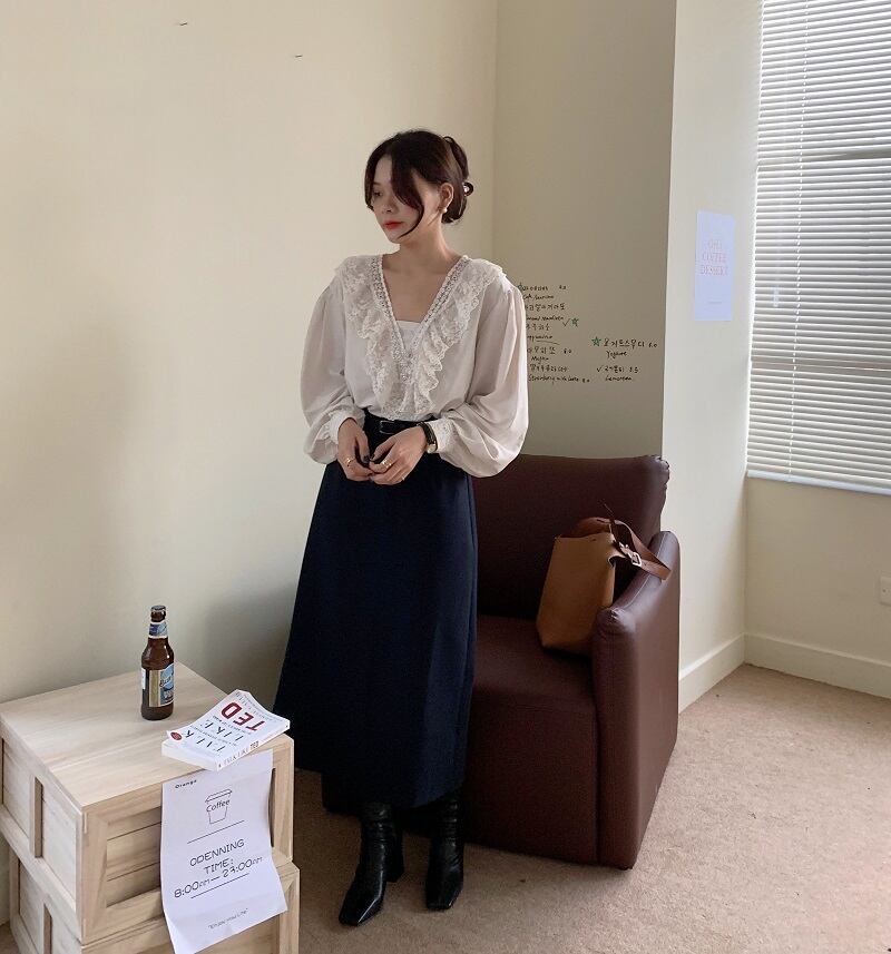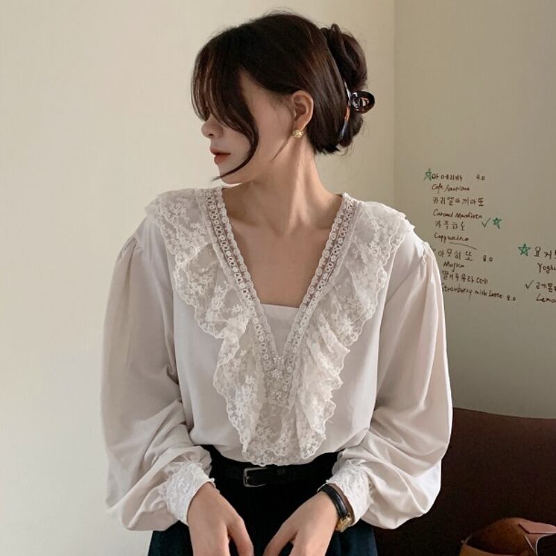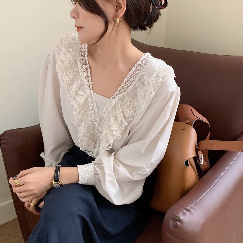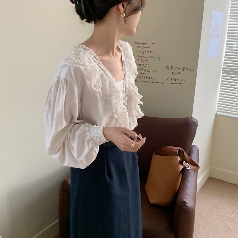 スプリングレースパールボタンルーズスリーブシャツ レディース ランタンスリーブ 大人ガーリー スウィート キュート カジュアル 春物 真珠 ステッチ 韓国婦人14976684423