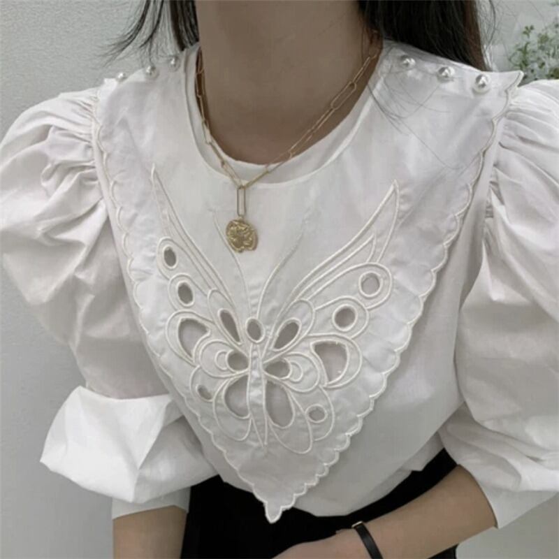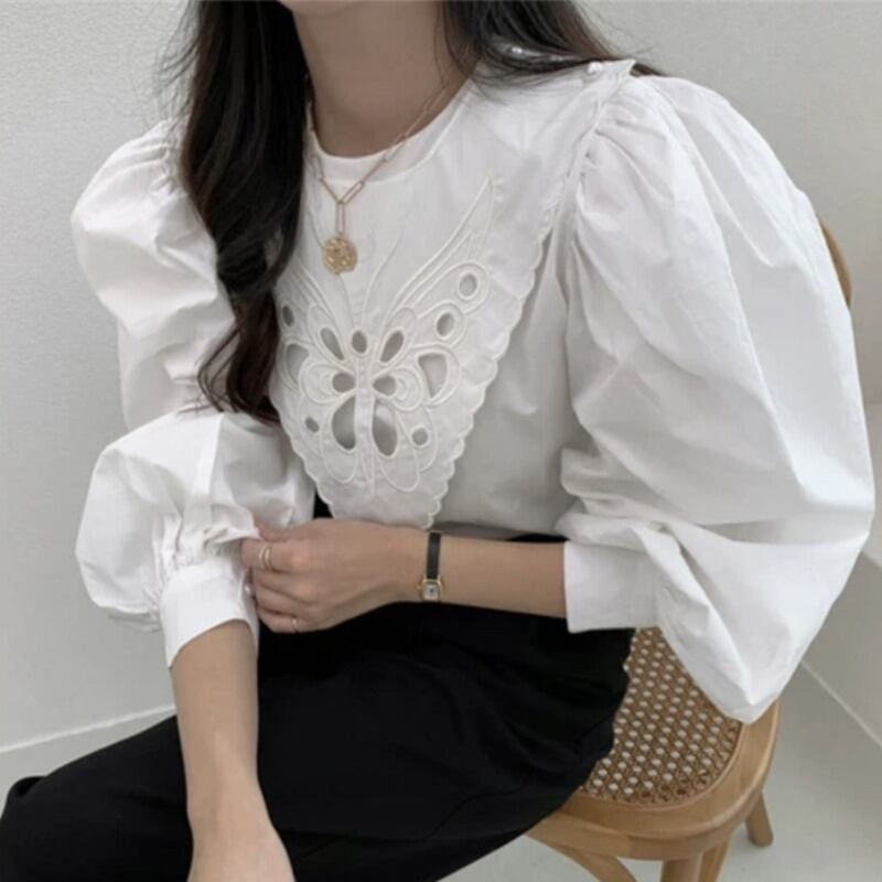 スプリングオータムドレス ラウンドネック刺繍スリーブホワイトレースシャツ ブラウス 春物 秋物 Oネック 韓国婦人97126429822