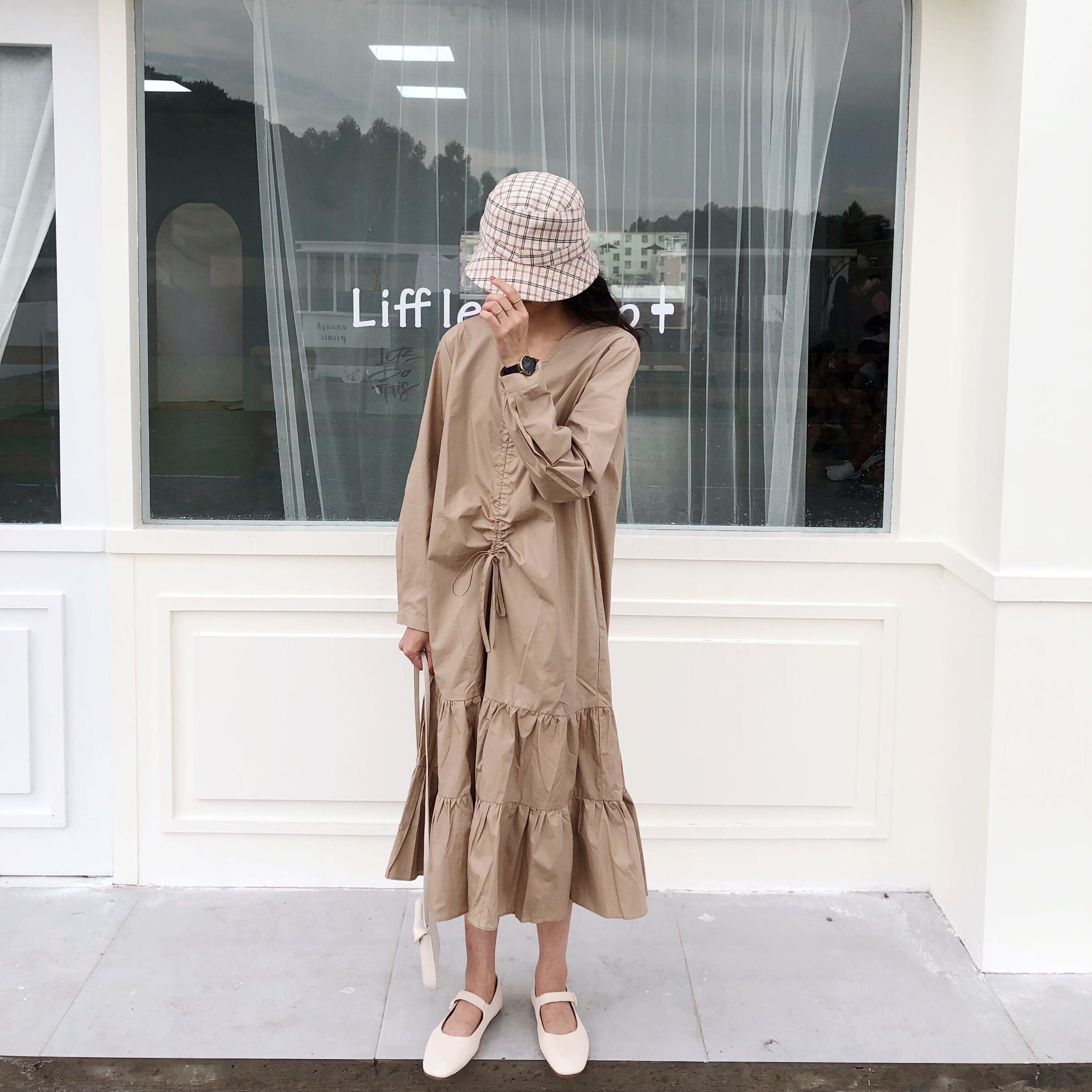 ルーズ薄手ギャザーリボンVネックラッフルスカート ドレス ロング 韓国婦人52049145957