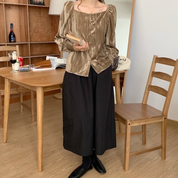 スタンダードカラースリーブベルベットブラウンシャツ ランタンスリーブ レトロ エレガント スクウェア 韓国婦人57194307266