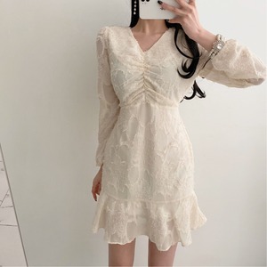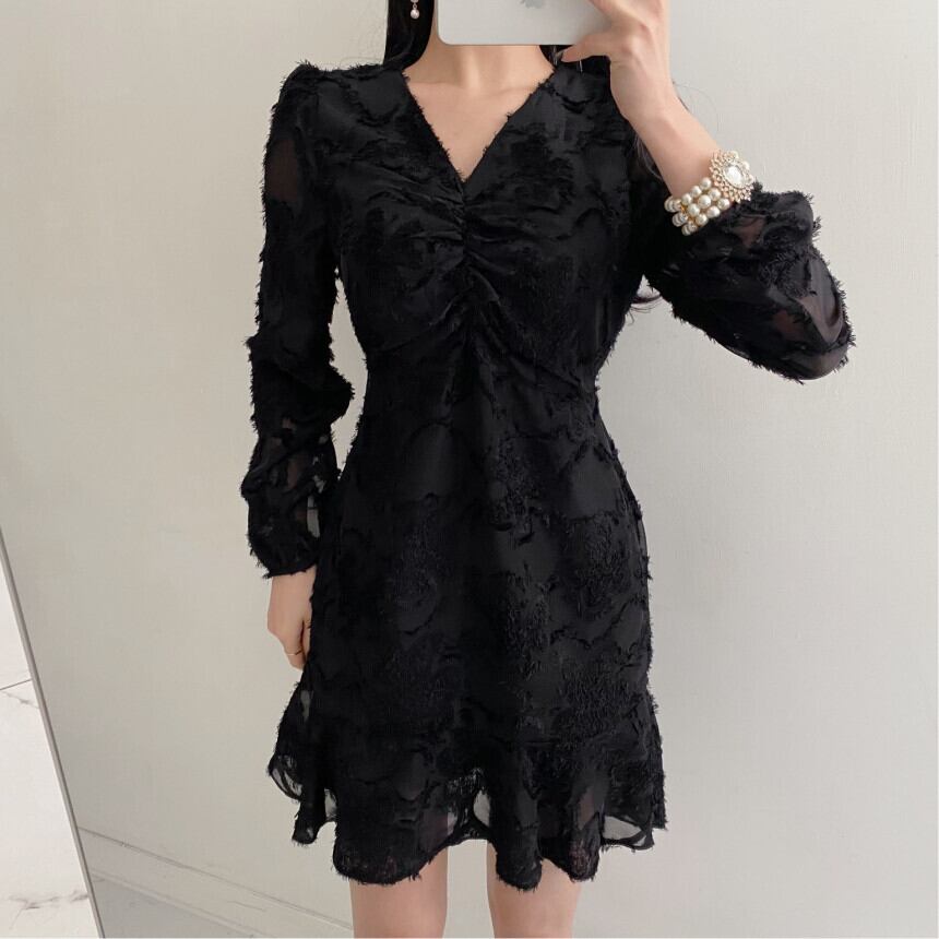 スプリングスタイルVネックソリッド カラーハイウェストウェストドレス レディース 春物 ソリッドカラー 韓国婦人44515418251