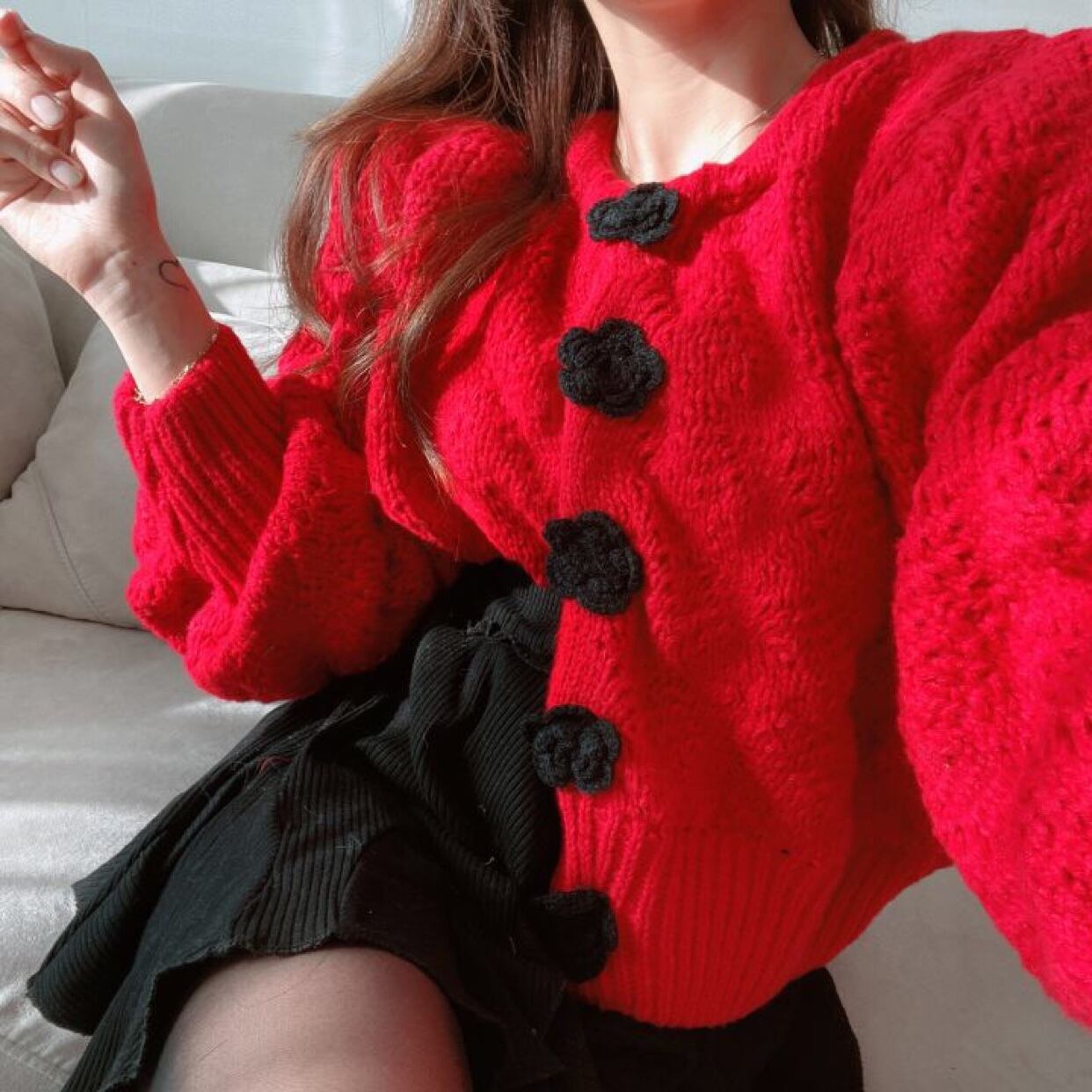 Flowerデザイン ボタンスリーブレッドセーター ジャケット スプリングオータムショートニットカーディガンハイウェストウェストスカート 春物 秋物 フラワーデザイン 韓国婦人45501065360