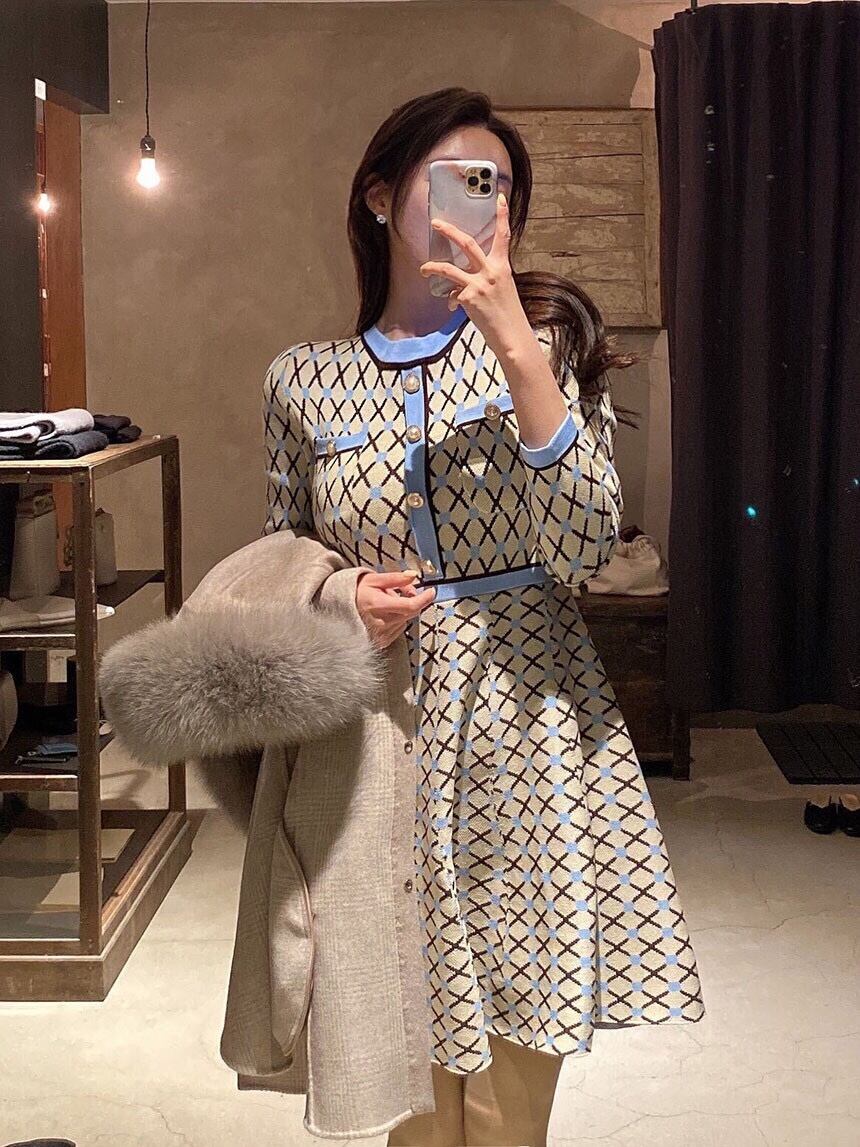 スプリングラウンドネックカラージャカードニットドレス スカート ロング 春物 Oネック 韓国婦人20275949306