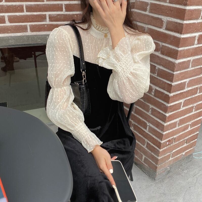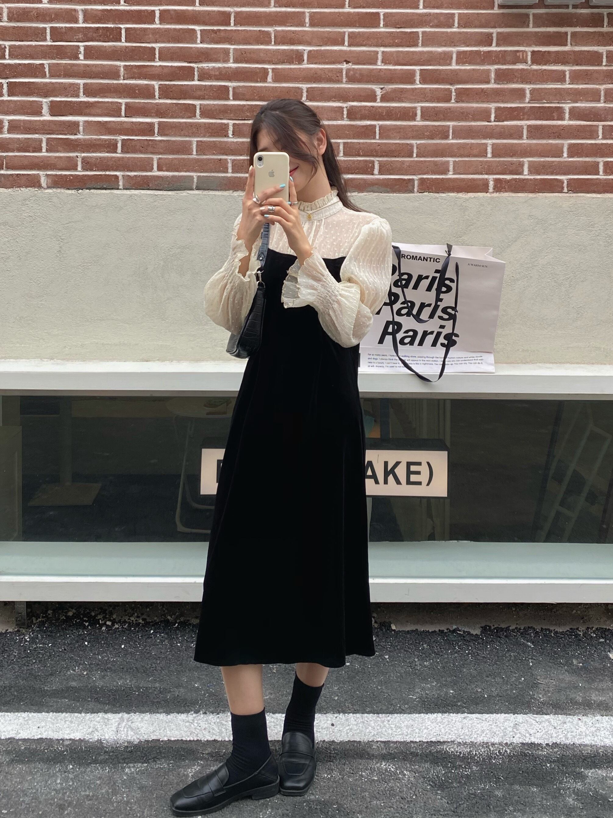 スプリングオータムゴールドベルベットドレス スタンダードスカート ロング レトロ 春物 秋物 韓国婦人14838600030