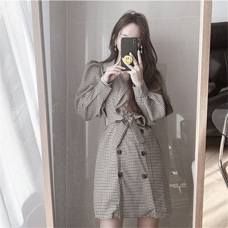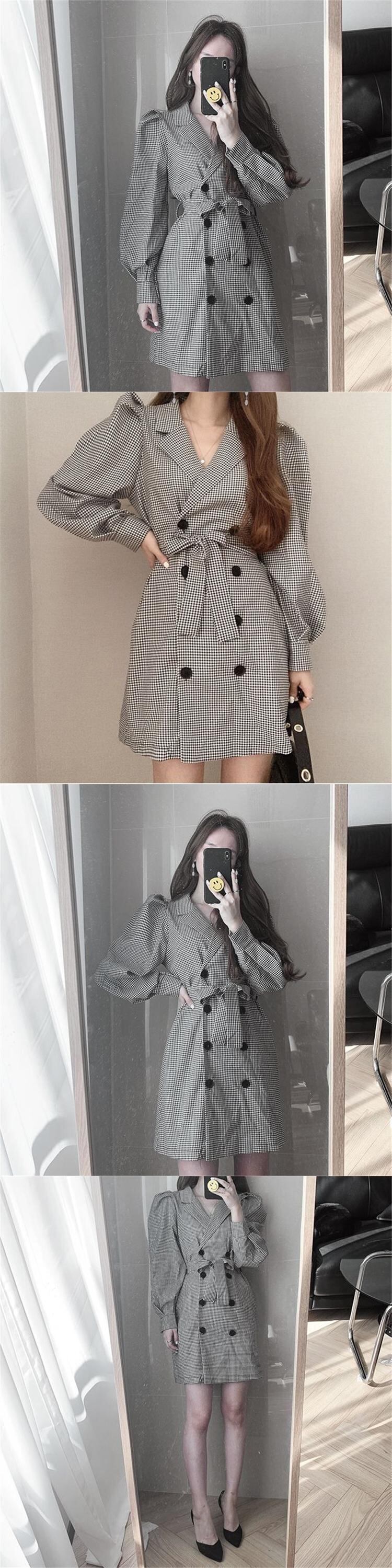 カラー格子柄ダブルブレストウェストスリーブドレス レディース レース レースアップ 韓国婦人60835584772