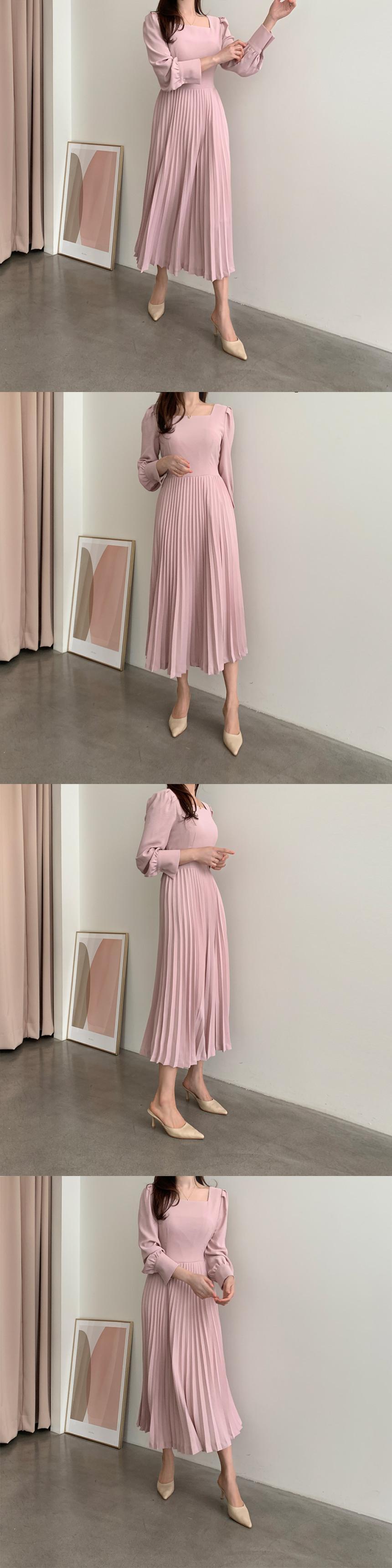 スリムロングプリーツドレス エレガント スクウェア 韓国婦人28035268412