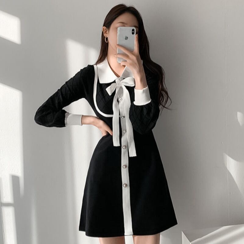 スタイルリボンパールボタンニットドレス スカート 真珠 韓国婦人45965051063