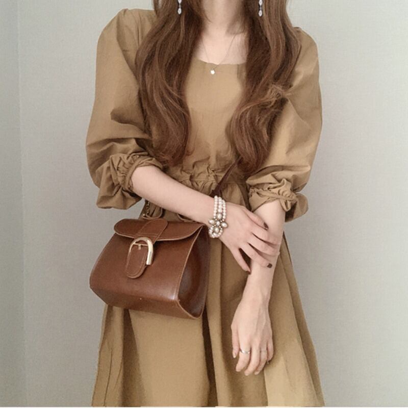 オータムカラー薄手ギャザーウェストスリーブドレス ロングスカート 秋物 スクウェア 韓国婦人10060023137