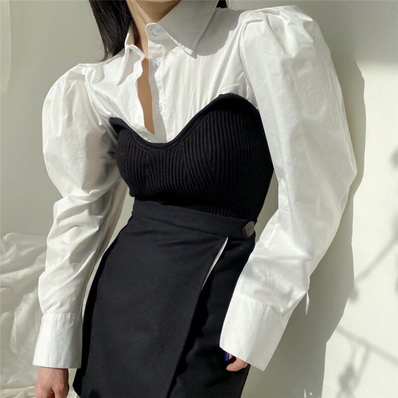 スプリングスタンダードニットスリーブシャツ スリムカラーブラウス ロング レトロ 春物 ステッチ 韓国婦人9215723490