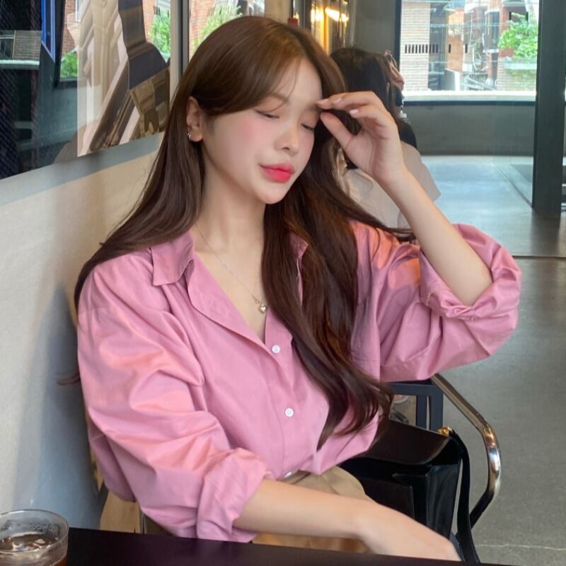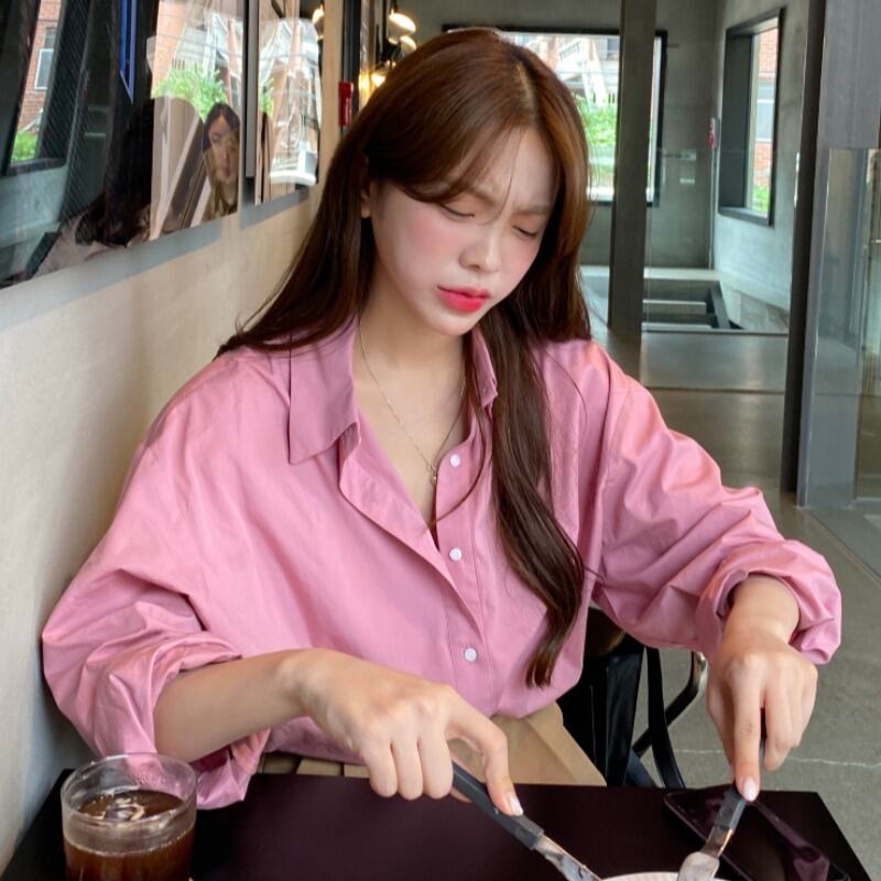 スプリングシャツ ルーズカジュアルトップス ロング ピンク 春物 韓国婦人20211194370