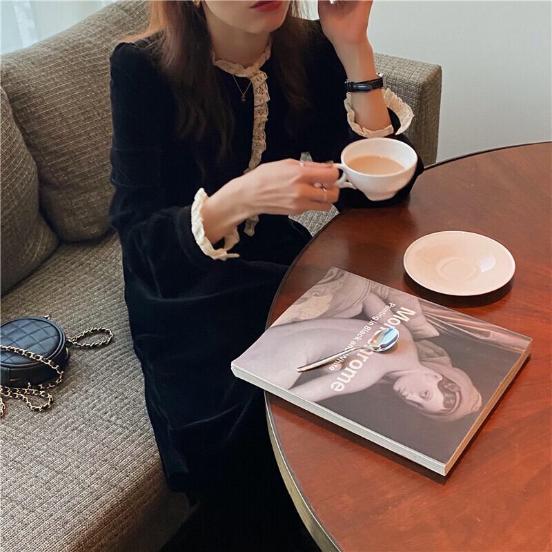 スプリングスタンダードドレス スタイルゴールドベルベットスカート ロング レトロ 春物 韓国婦人79074243367