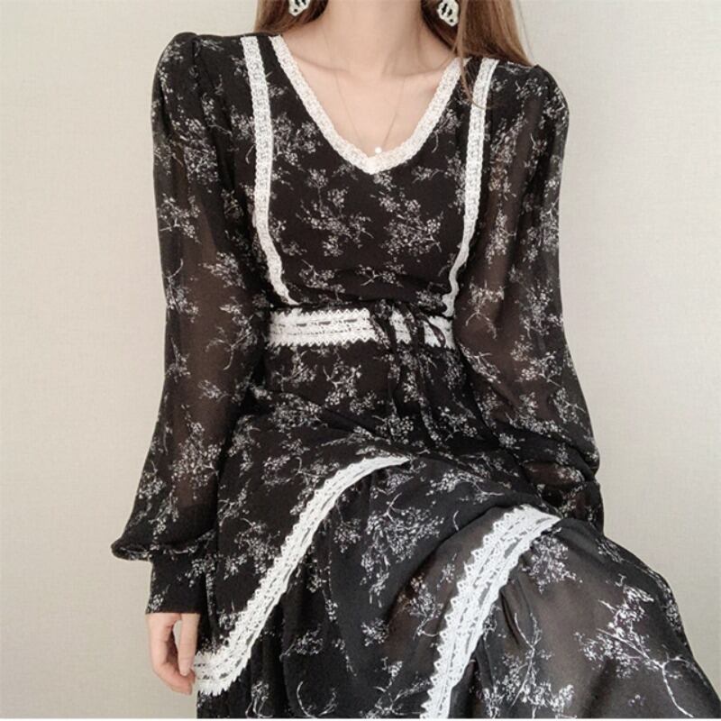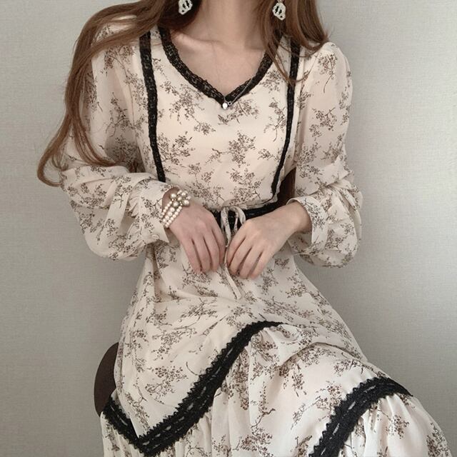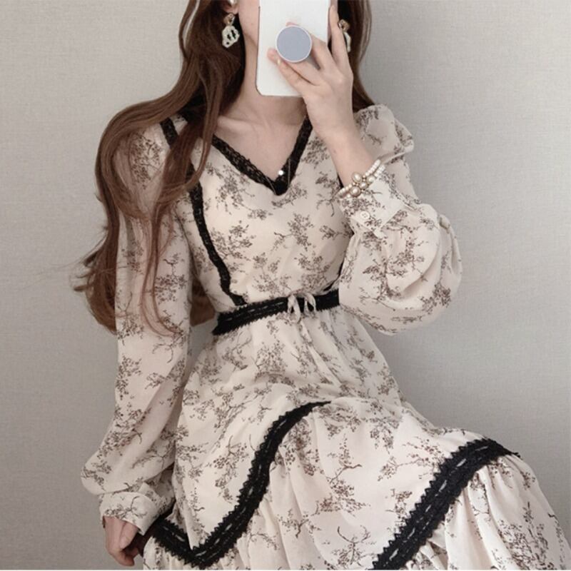 スタンダードスタイルロングスカート フローラルシフォンドレス レトロ 花柄 韓国婦人69926941781