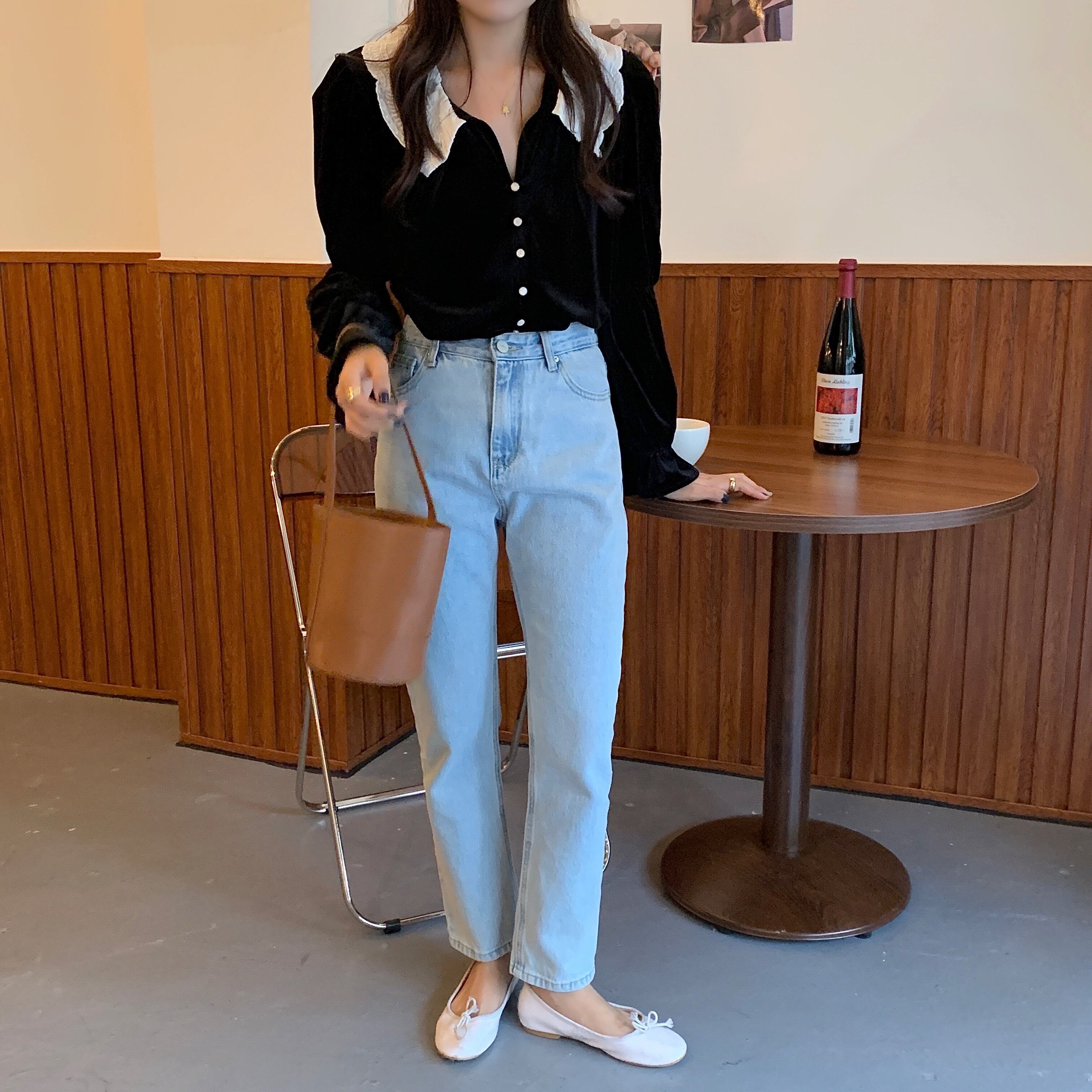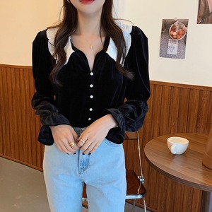 カラーシャツ スプリングスタンダード刺繍スリーブベルベットトップス レトロ 春物 ステッチ 韓国婦人69050304738