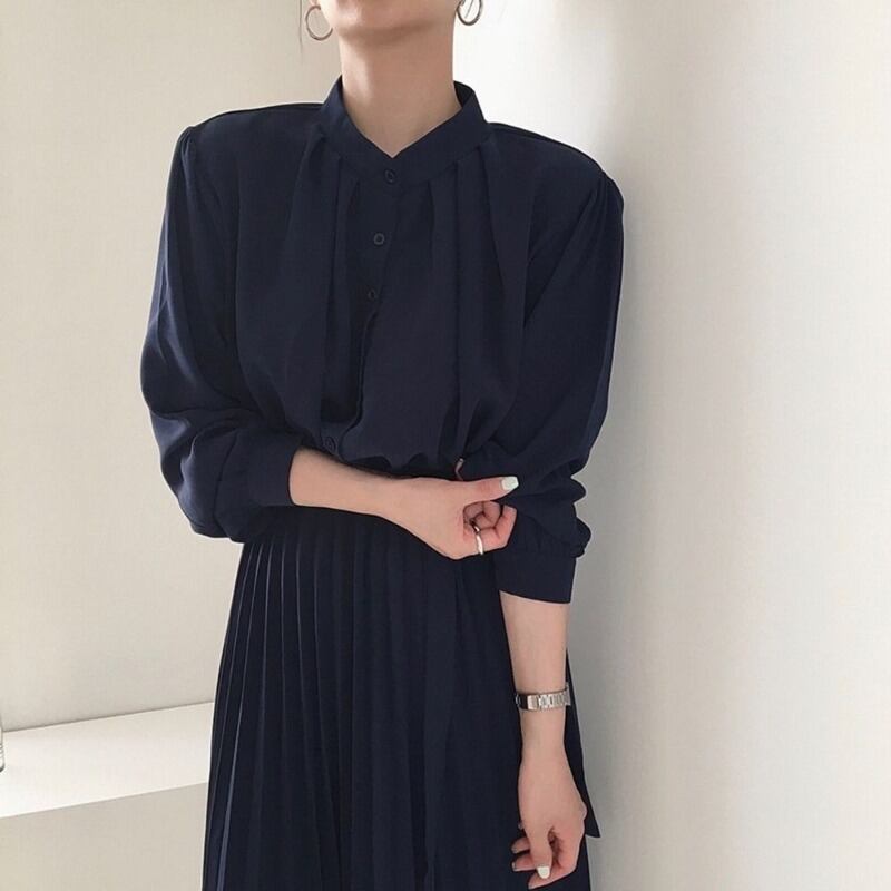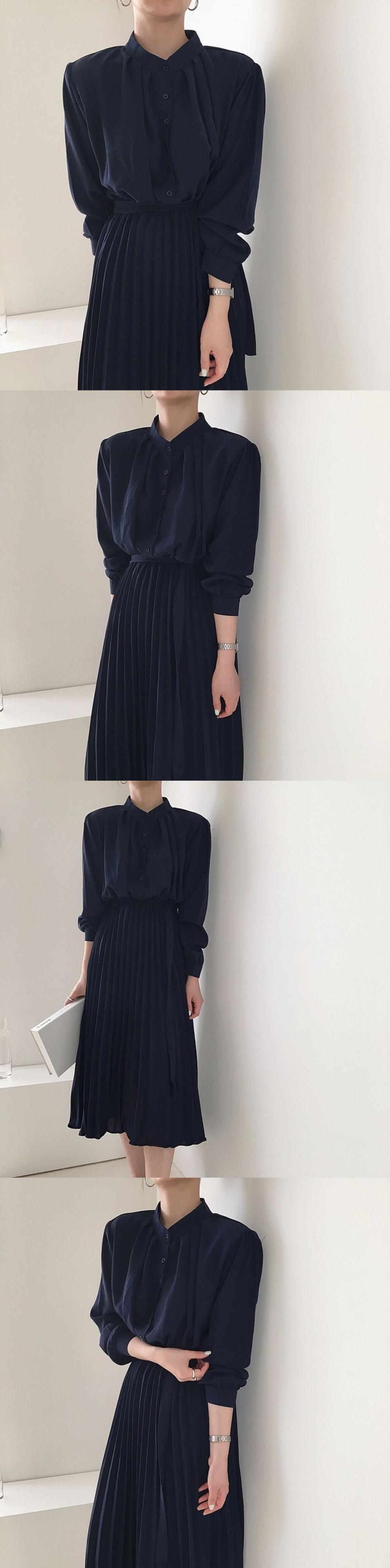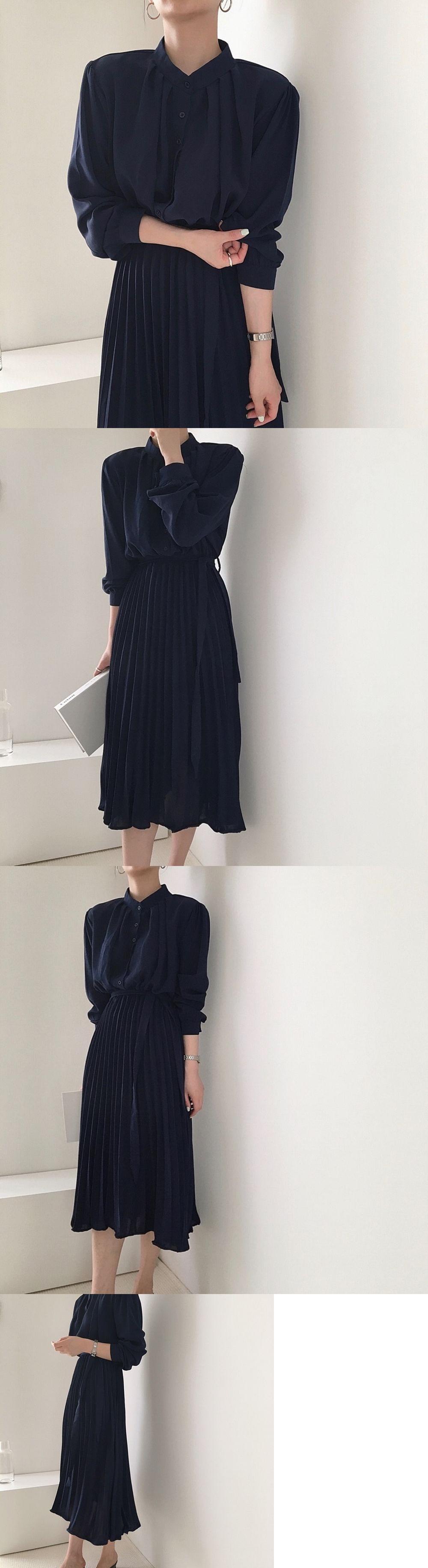 カラー薄手ウェストロングプリーツドレス レディース 韓国婦人59905117758