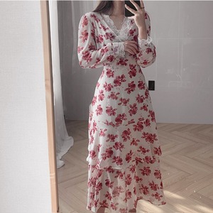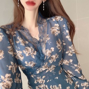 スタイルスタンダードレースシフォンVネックドレス ウェスト薄手 レトロ 韓国婦人13646730392