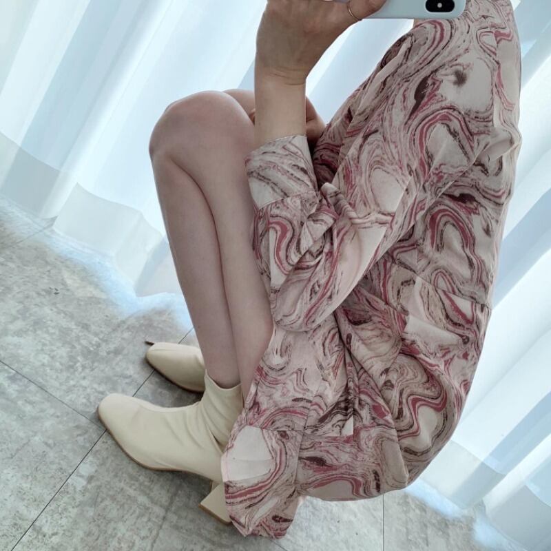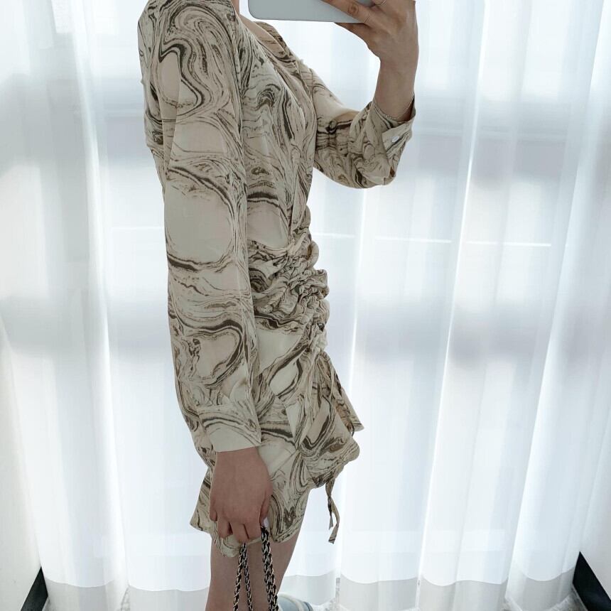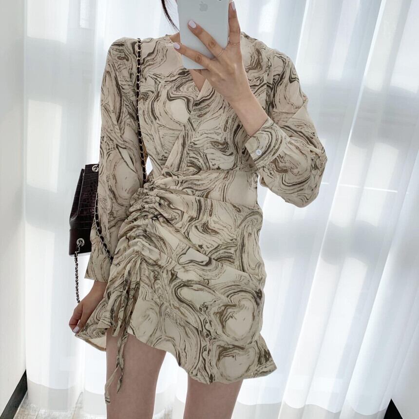 スプリングプリントギャザーショートスカート プリーツVネックドレス レディース ロング 春物 韓国婦人4915567830