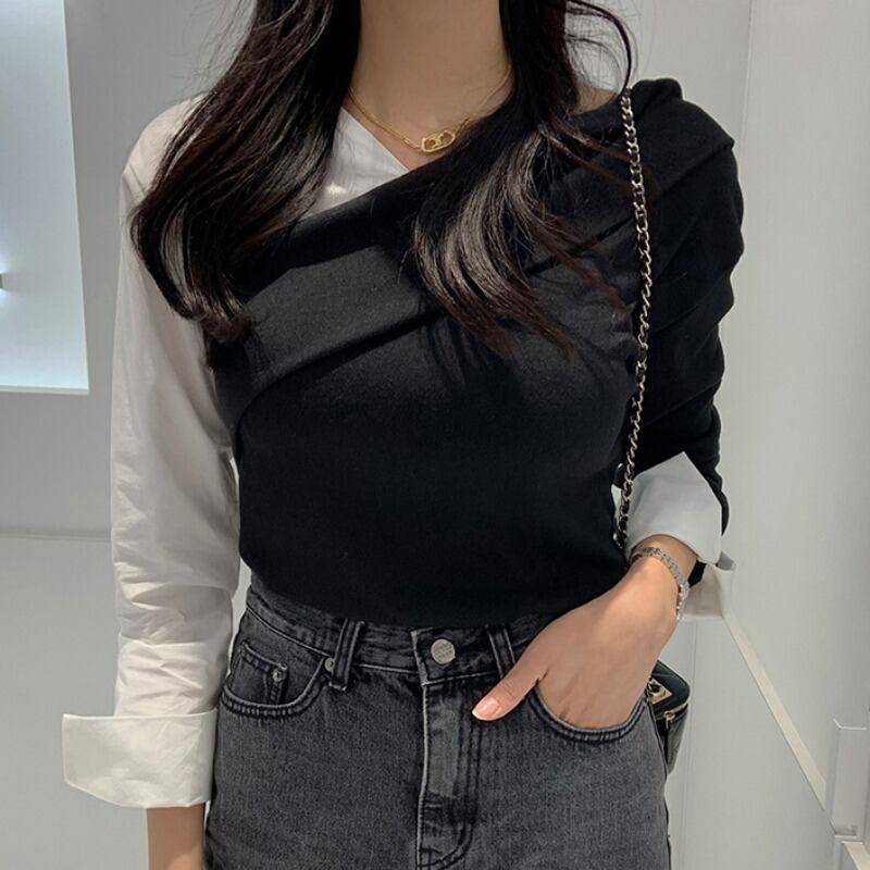 スプリングカラーシャツ ニットブラウス 春物 ステッチ 韓国婦人88104054998