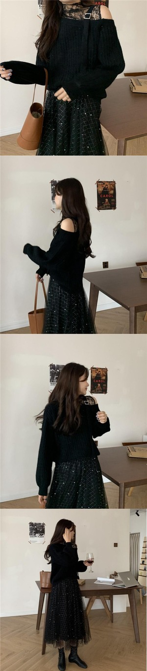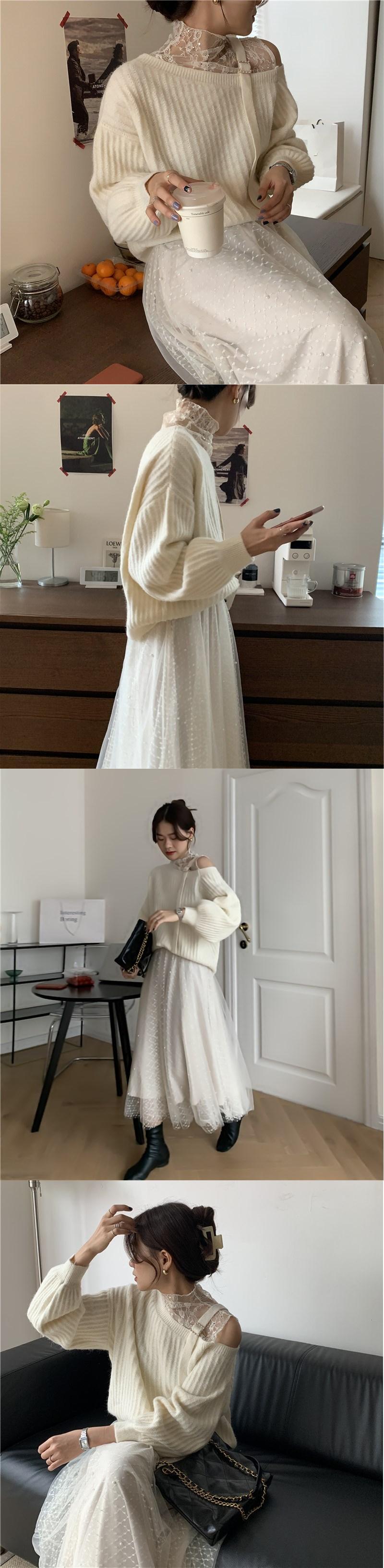 レースカラーセーター メッシュスカート レディース ロング オフショルダー シルク ステッチ 韓国婦人92373850658