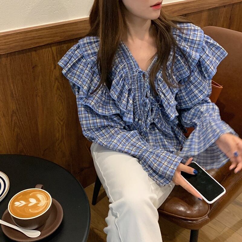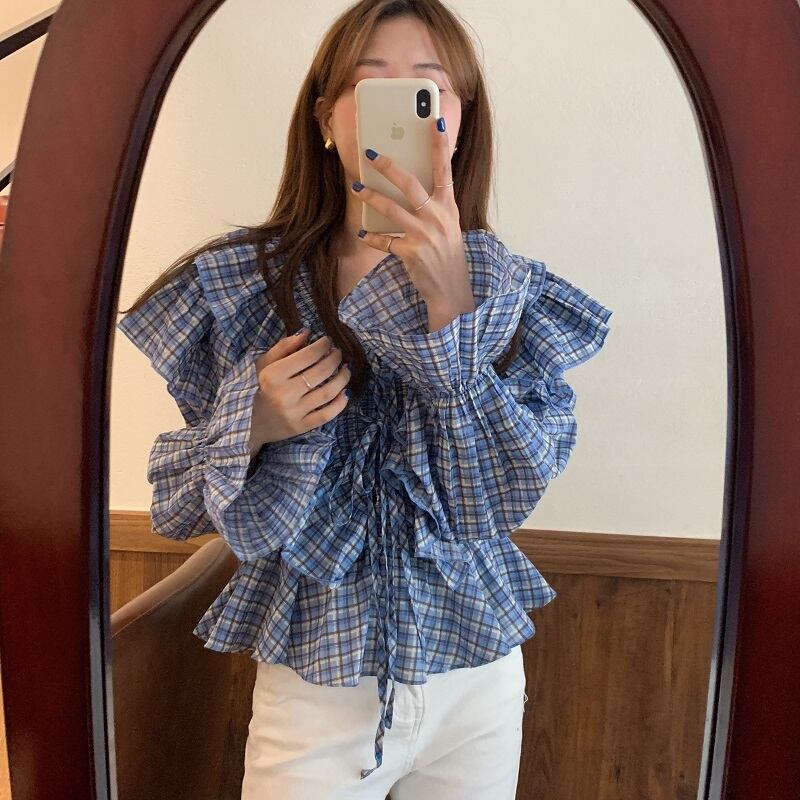 格子柄シャツ スプリングスタンダードウェストシフォン レトロ レース 春物 レースアップ 韓国婦人81996178897