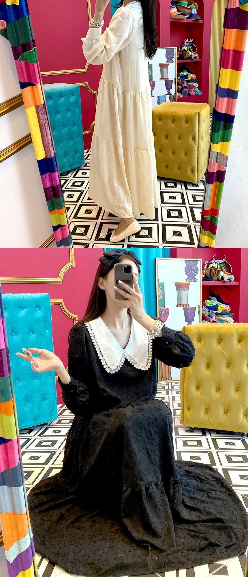 スプリングオータムレースカラー長袖スリーブルーズウェストジャカードシフォンドレス ロング 春物 秋物 韓国婦人36596526613