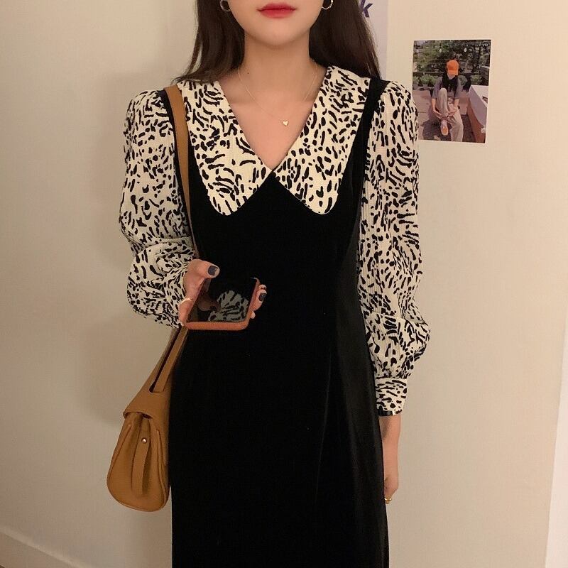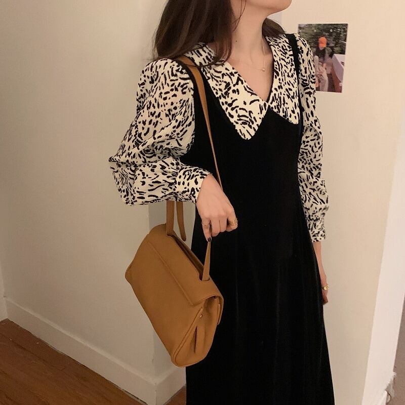 オータムカラースリーブレオパードプリント柄ベルベットドレス 秋物 ステッチ 韓国婦人26750520715