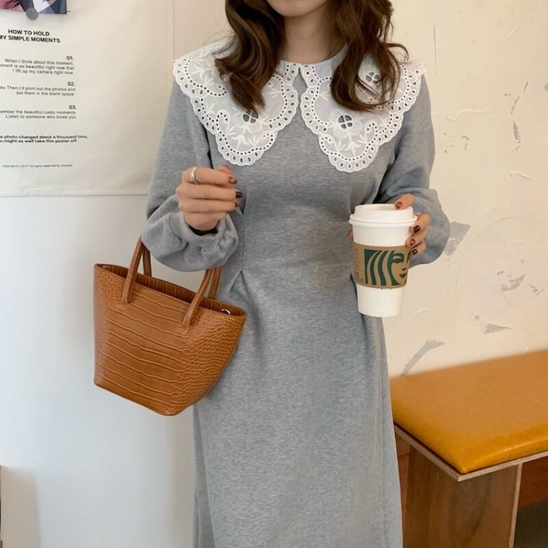 スプリングオータムスタンダードスリーブショートカラーラッフルドレス ランタンスリーブ レトロ 大人ガーリー スウィート キュート カジュアル 春物 秋物 韓国婦人95986486362