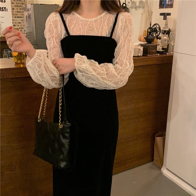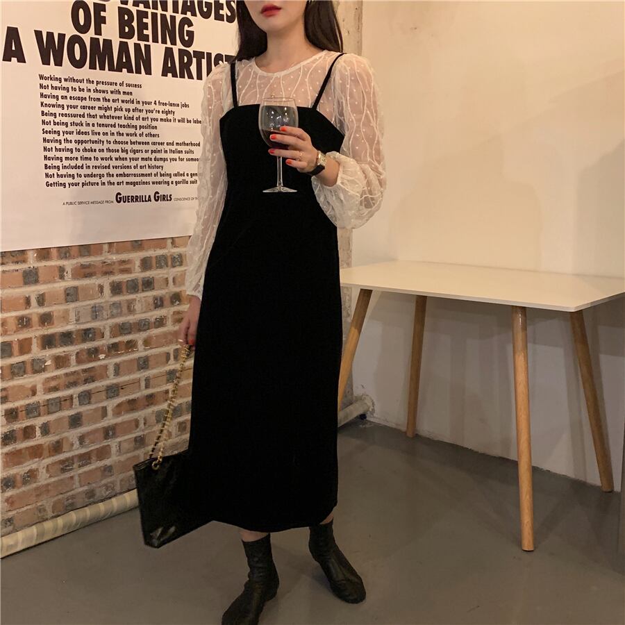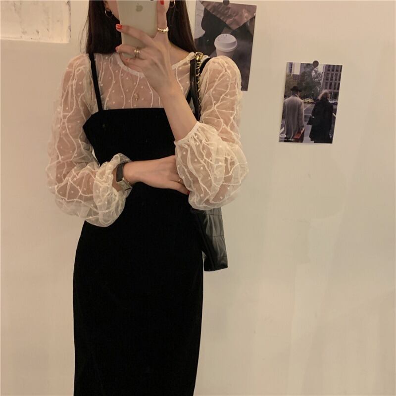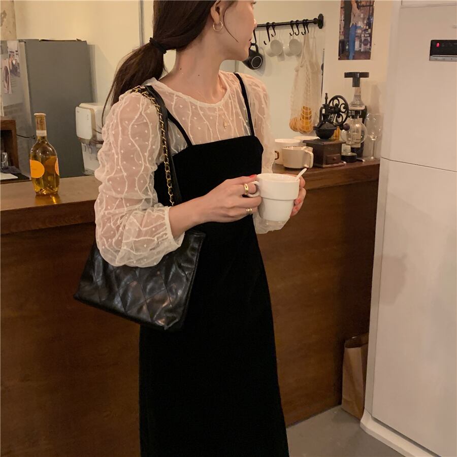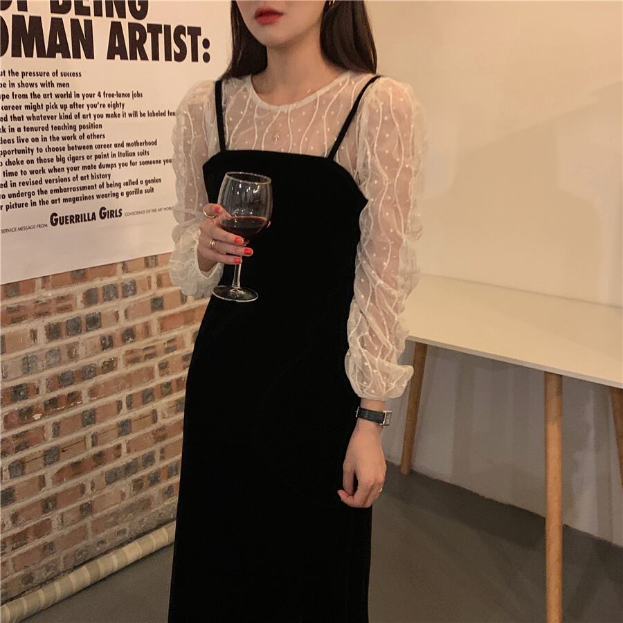 スプリングメッシュトップス スリムベルベットドレス 春物 韓国婦人13496697110