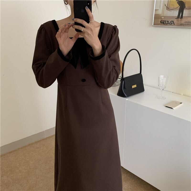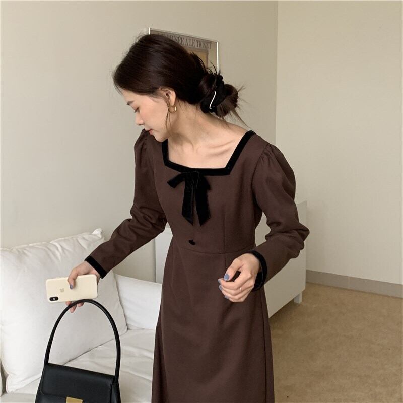スカート スプリングスタイルウェストリボンドレス ロング 春物 スクウェア 韓国婦人40300405343