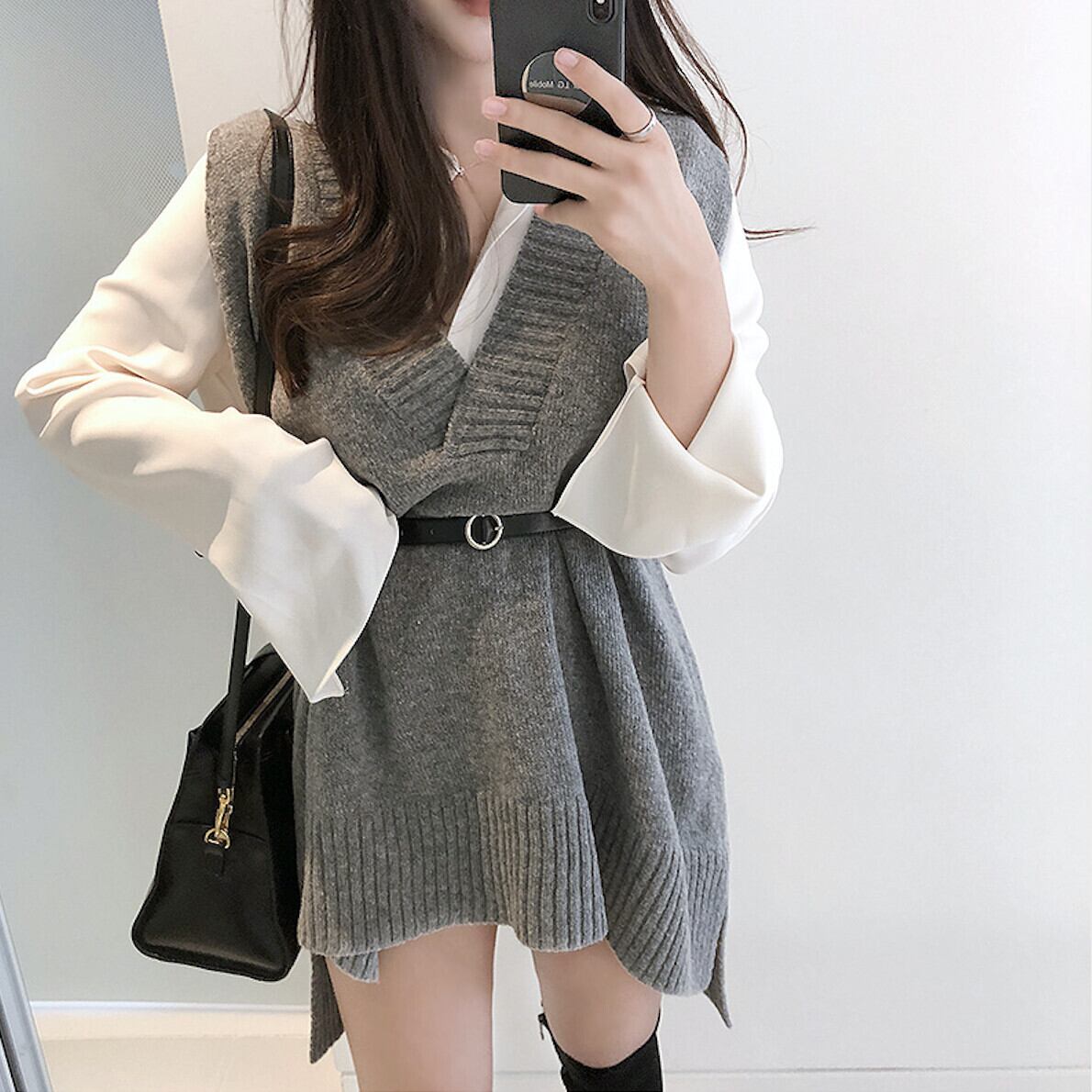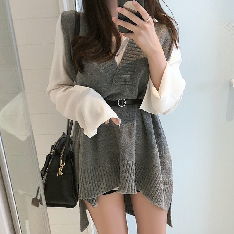 ホワイトシャツ ニット ロング 韓国婦人70768594777