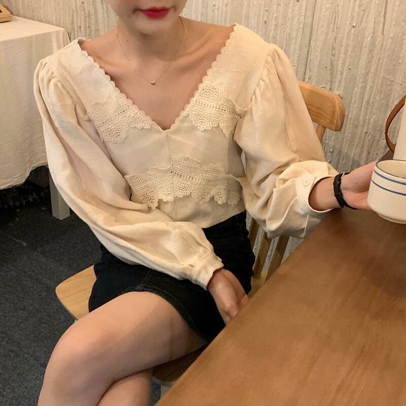 オータムスタイルVネックレーススリーブショートシャツ ランタンスリーブ 秋物 ステッチ 韓国婦人81896417279