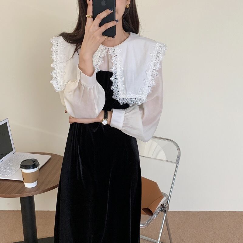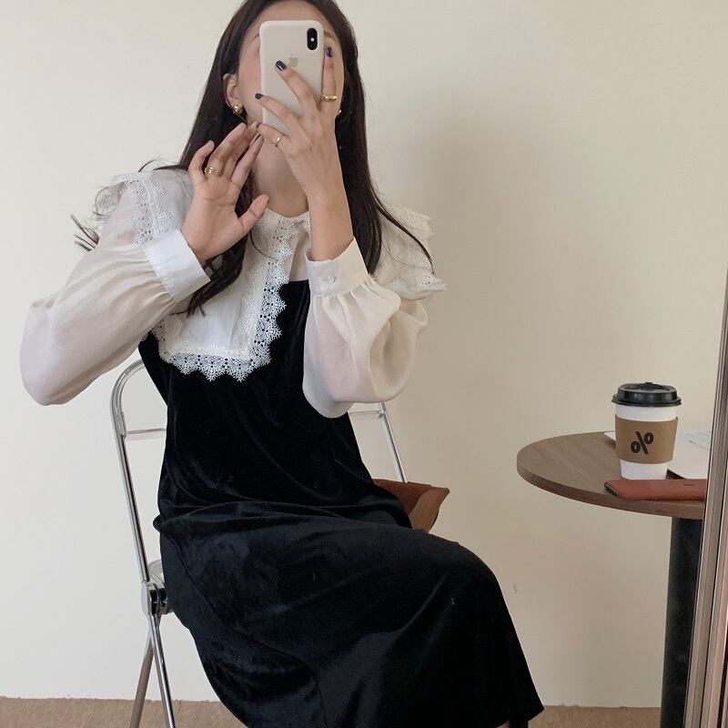 スプリングレースカラーブラックドレス ゴールドベルベットスリム 春物 ステッチ 韓国婦人54991704680
